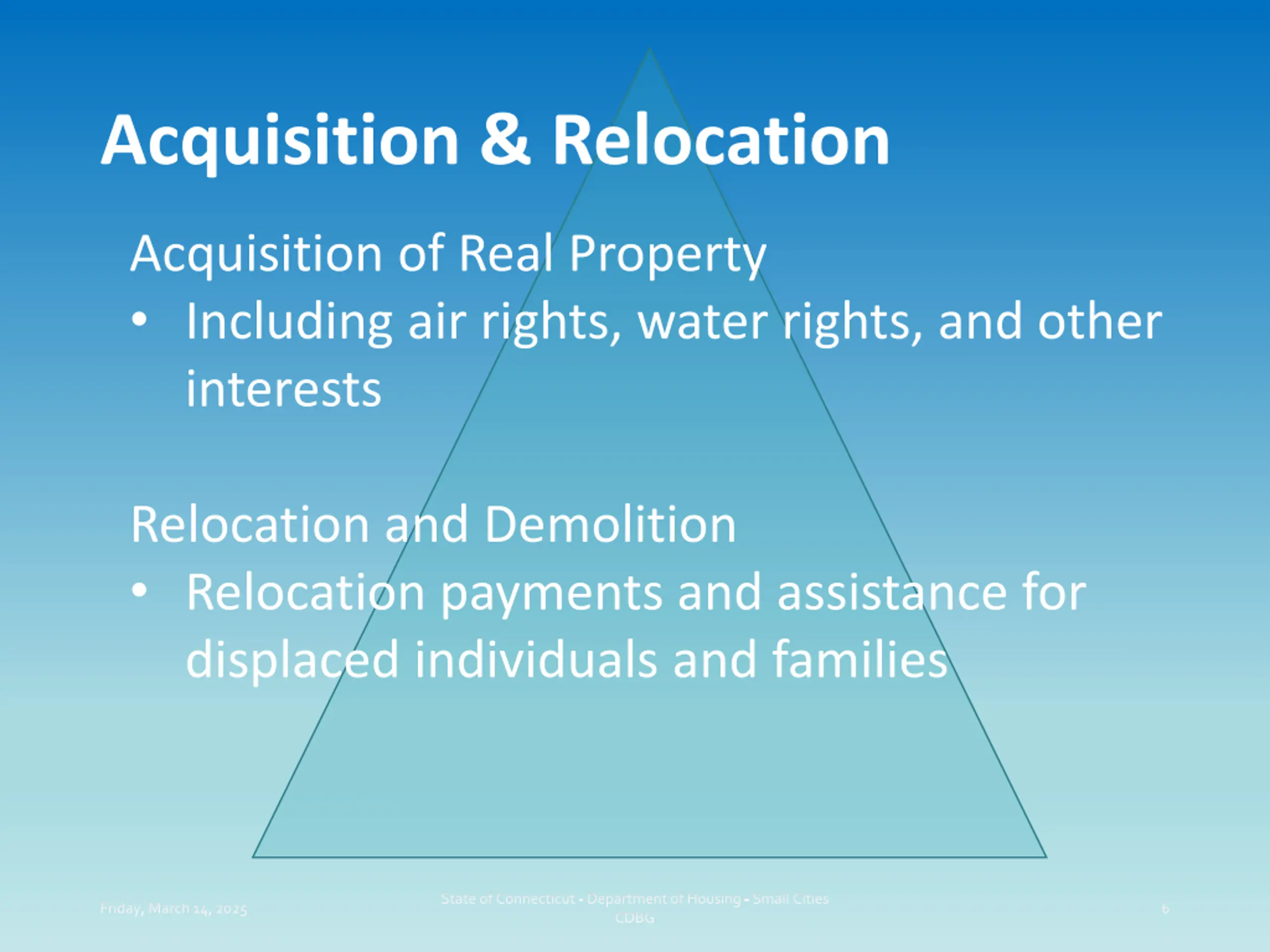 Acquisition & Relocation Acquisition of Real Property Including air rights, water rights, and other interests Relocation and Demolition Relocation payments and assistance for displaced individuals and families State of Connecticut - Department of Housing - Small Cities CDBG Friday, March 14, 2025 6