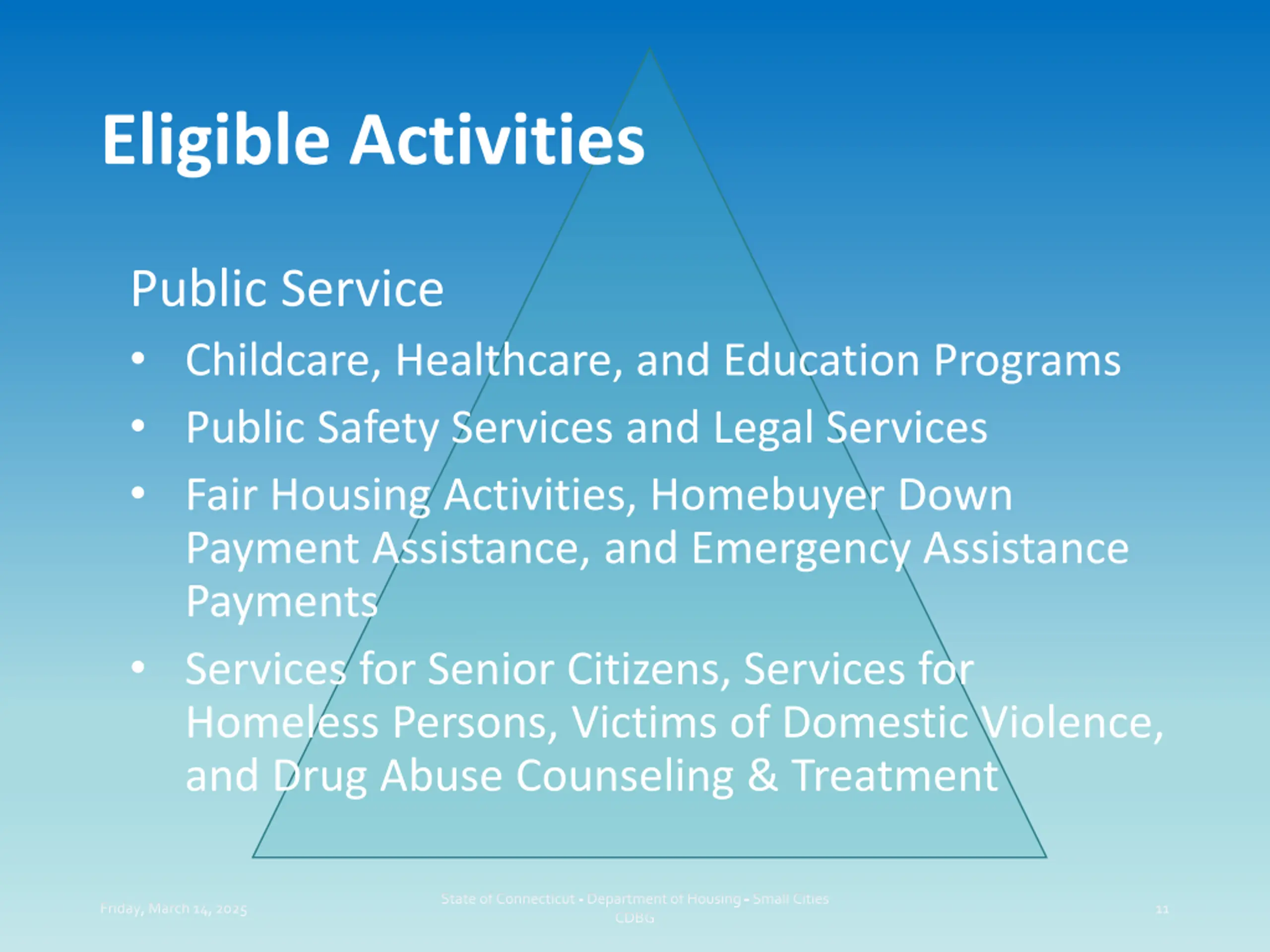 Eligible Activities Public Service Childcare, Healthcare, and Education Programs Public Safety Services and Legal Services Fair Housing Activities, Homebuyer Down Payment Assistance, and Emergency Assistance Payments Services for Senior Citizens, Services for Homeless Persons, Victims of Domestic Violence, and Drug Abuse Counseling & Treatment State of Connecticut - Department of Housing - Small Cities CDBG Friday, March 14, 2025 11