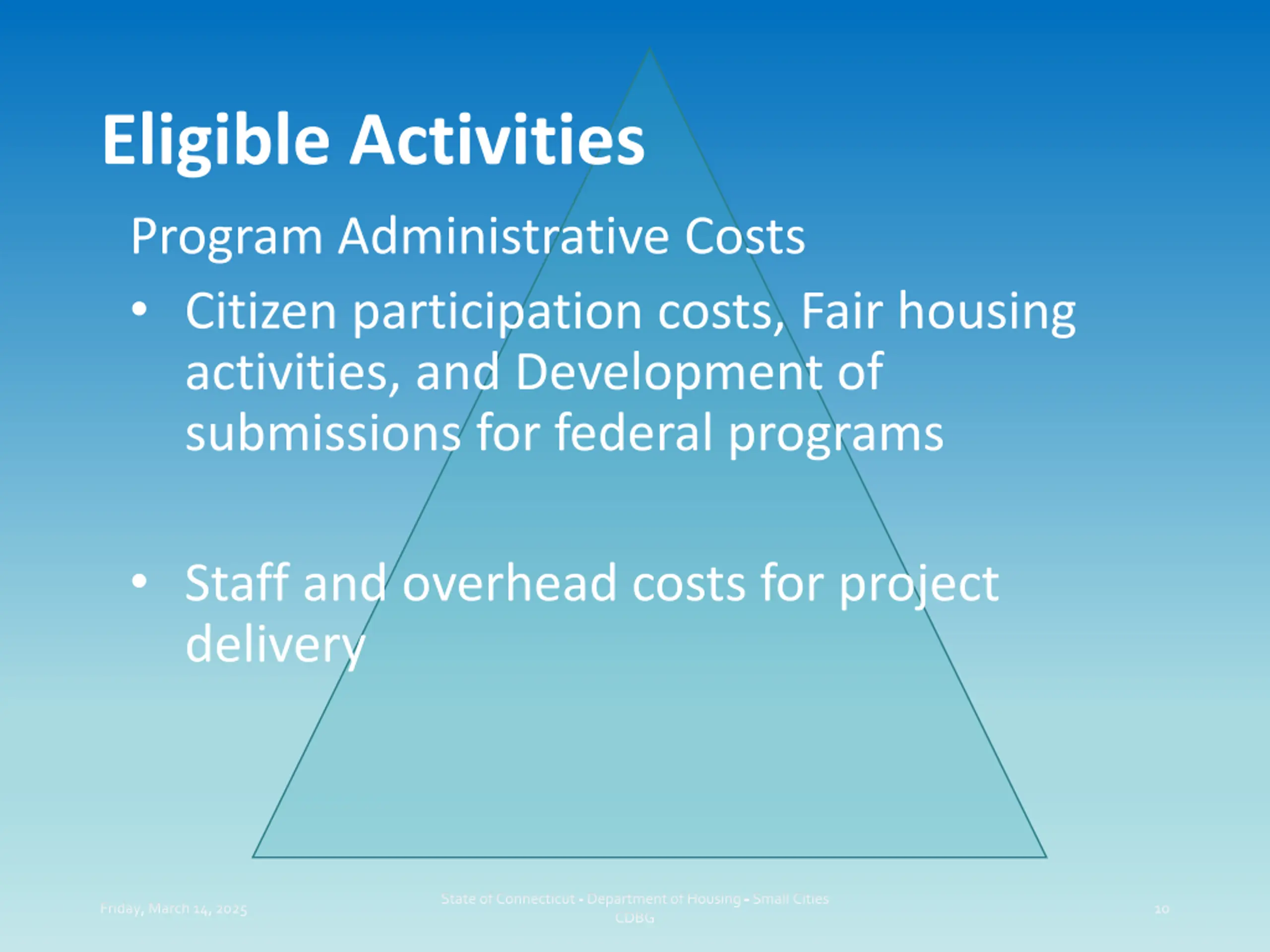 Eligible Activities Program Administrative Costs Citizen participation costs, Fair housing activities, and Development of submissions for federal programs Staff and overhead costs for project delivery State of Connecticut - Department of Housing - Small Cities CDBG Friday, March 14, 2025 10