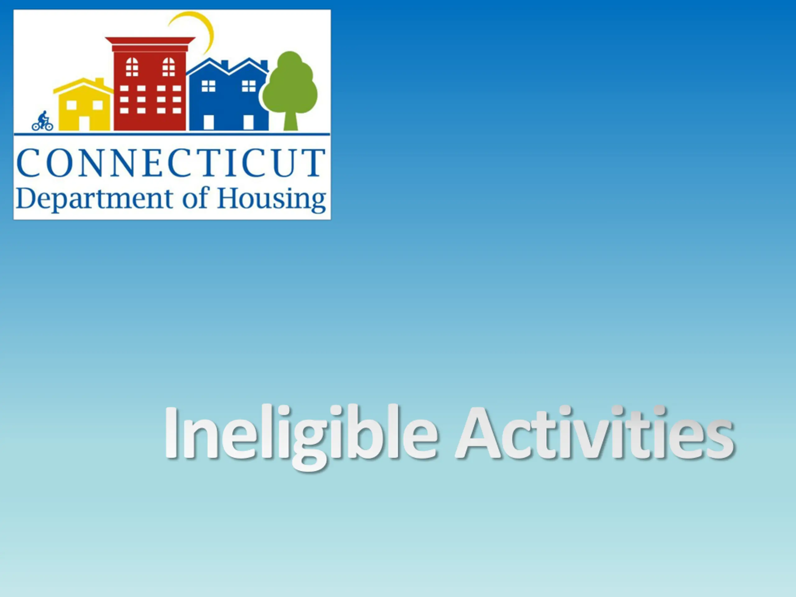 Buildings to Conduct General Government Business Ineligible Activities Political Activities Construction of New Housing State of Connecticut - Department of Housing - Small Cities CDBG Friday, March 14, 2025 14