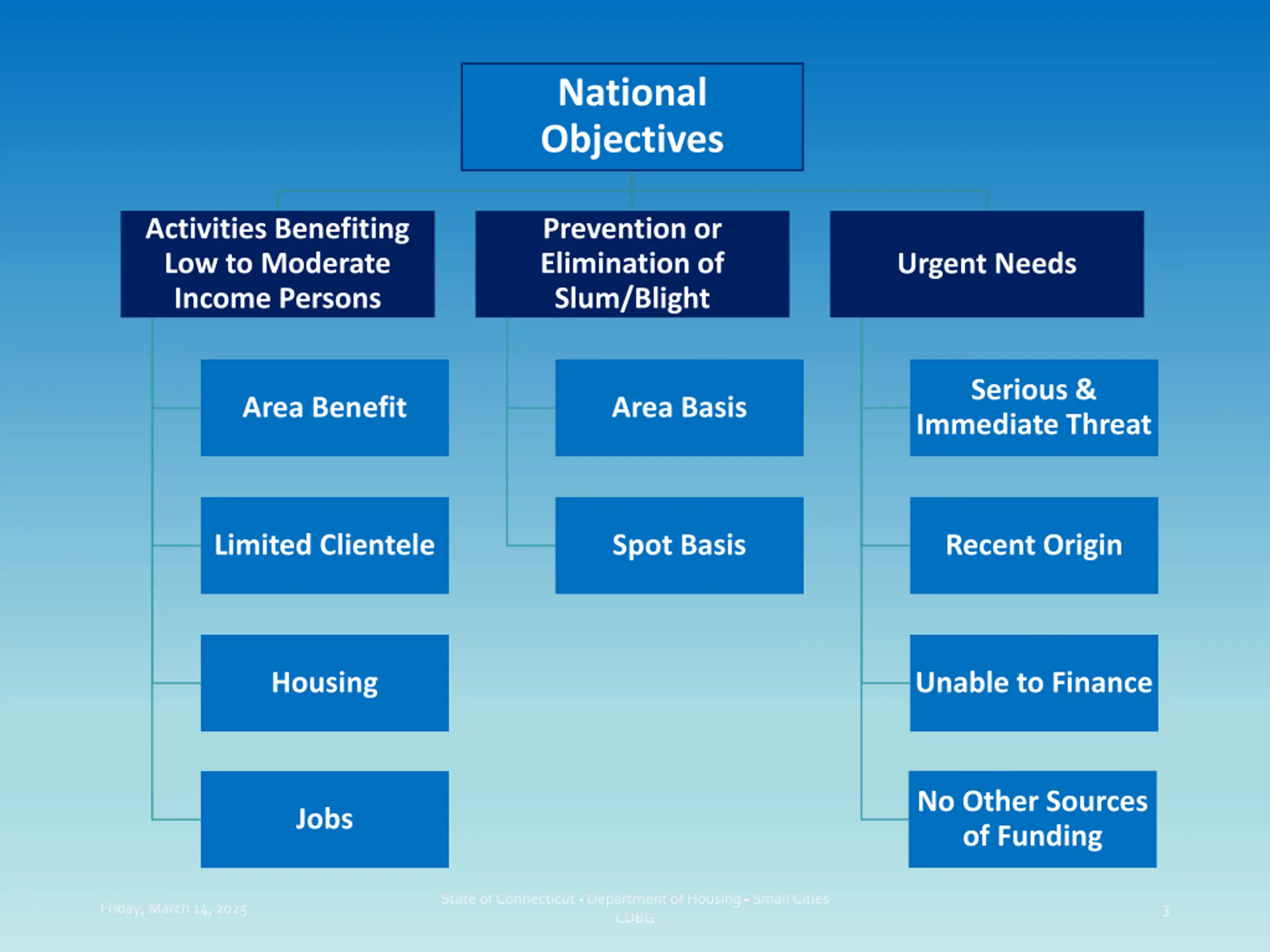 National Objectives Activities Benefiting Low to Moderate Income Persons Prevention or Elimination of Slum/Blight Urgent Needs Serious & Immediate Threat Area Benefit Area Basis Limited Clientele Spot Basis Recent Origin Housing Unable to Finance No Other Sources of Funding Jobs State of Connecticut - Department of Housing - Small Cities CDBG Friday, March 14, 2025 3