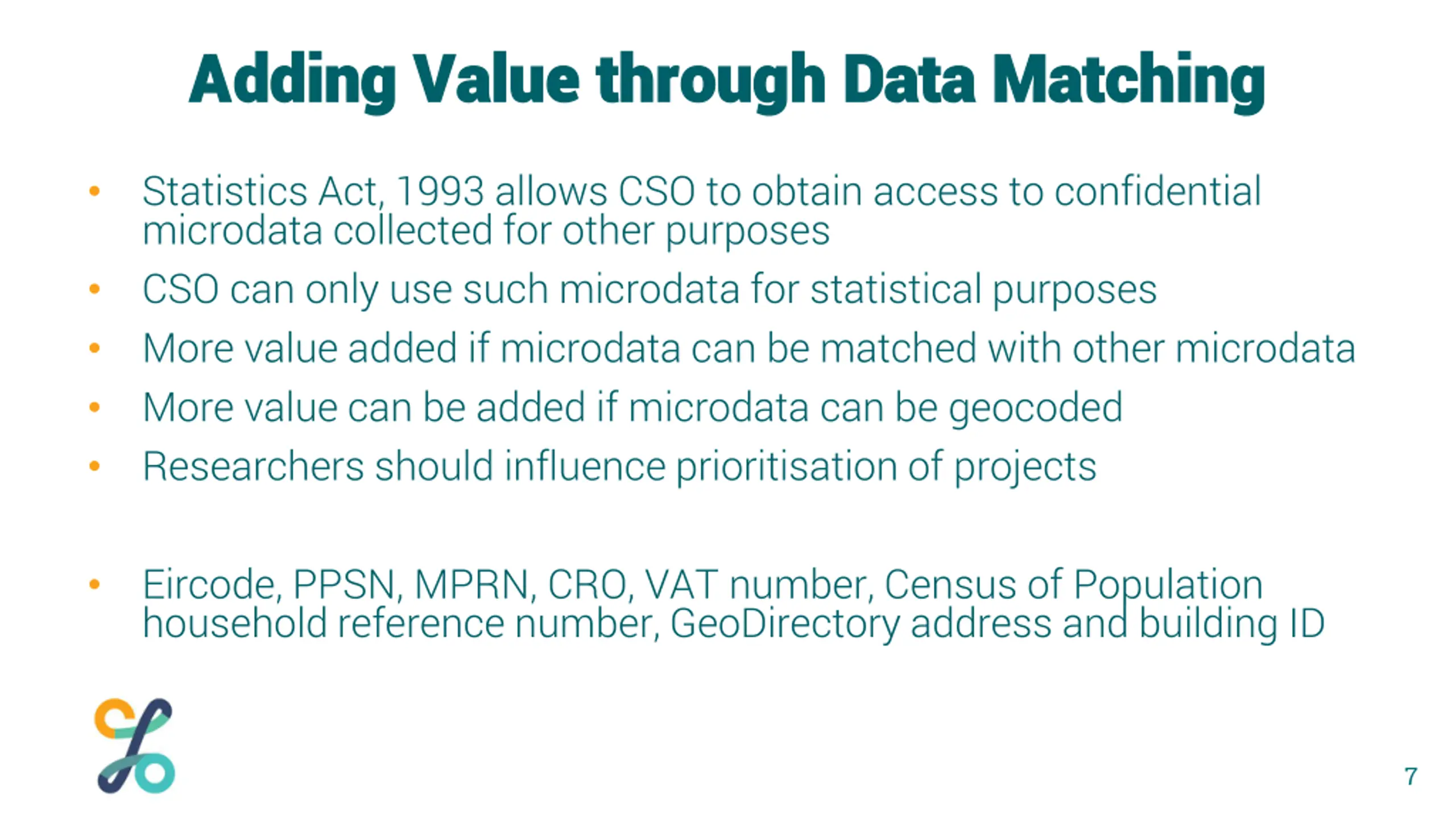 Adding Value through Data Matching Adding Value through Data Matching Statistics Act, 1993 allows CSO to obtain access to confidential microdata collected for other purposes CSO can only use such microdata for statistical purposes More value added if microdata can be matched with other microdata More value can be added if microdata can be geocoded Researchers should influence prioritisation of projects Eircode, PPSN, MPRN, CRO, VAT number, Census of Population household reference number, GeoDirectory address and building ID 7
