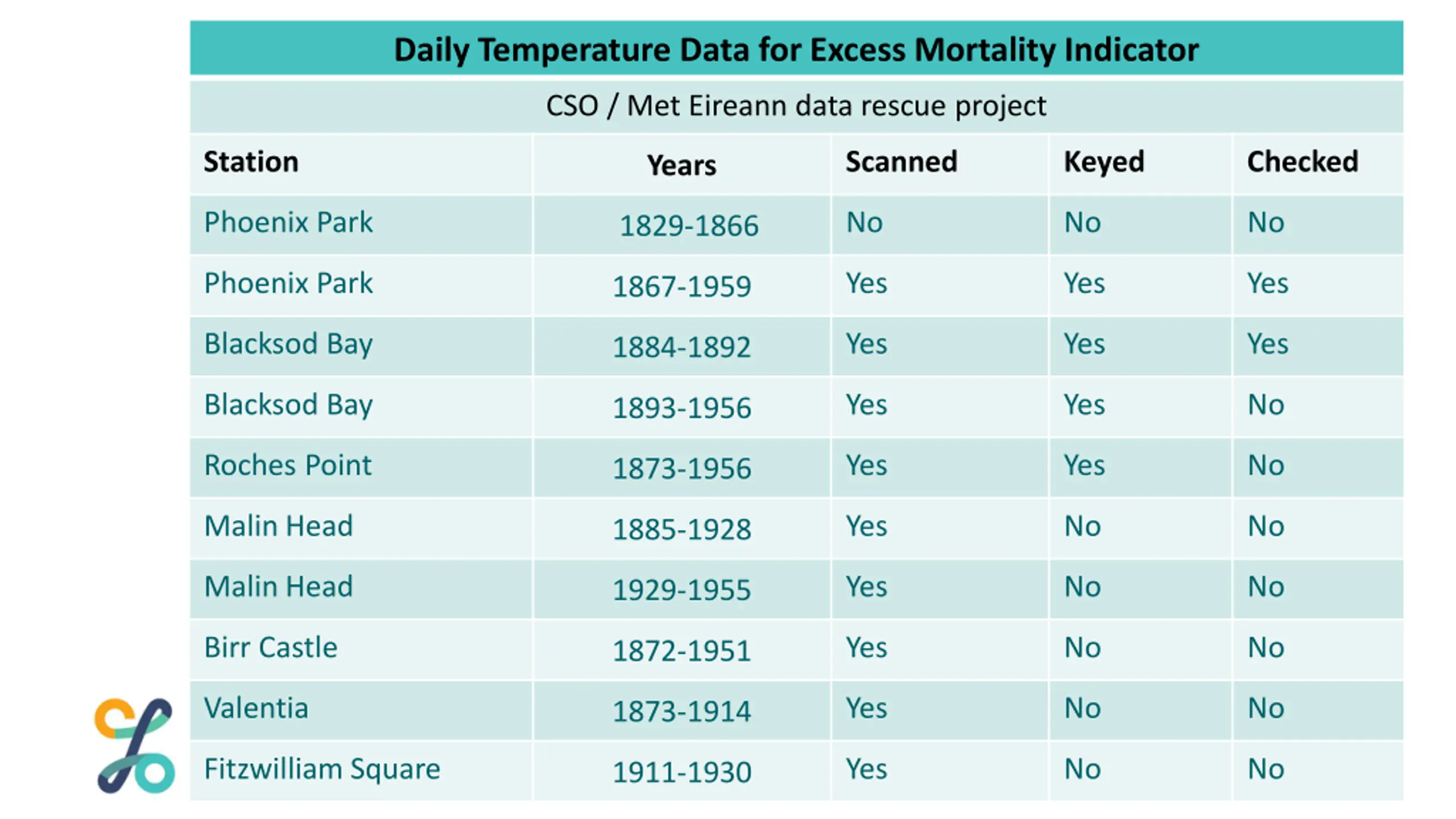 Daily Temperature Data for Excess Mortality Indicator CSO / Met Eireann data rescue project Station Scanned Keyed Checked Years Phoenix Park No No No 1829-1866 Phoenix Park Yes Yes Yes 1867-1959 Blacksod Bay Yes Yes Yes 1884-1892 Blacksod Bay Yes Yes No 1893-1956 Roches Point Yes Yes No 1873-1956 Malin Head Yes No No 1885-1928 Malin Head Yes No No 1929-1955 Birr Castle Yes No No 1872-1951 Valentia Yes No No 1873-1914 Fitzwilliam Square Yes No No 1911-1930