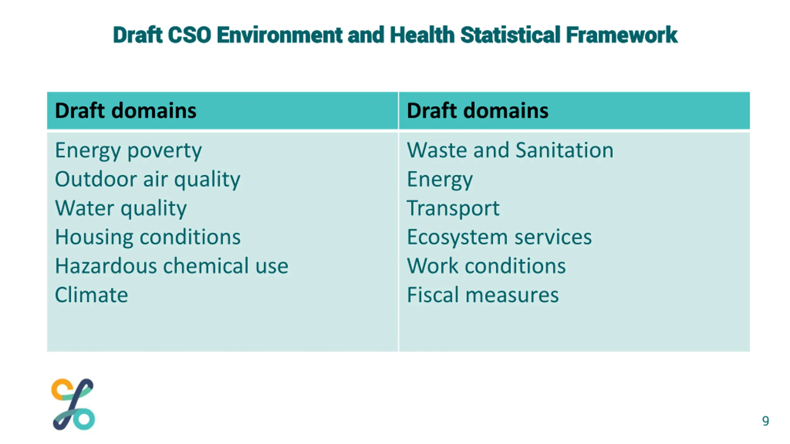 Draft CSO Environment and Health Statistical Framework Draft CSO Environment and Health Statistical Framework Draft domains Draft domains Energy poverty Outdoor air quality Water quality Housing conditions Hazardous chemical use Climate Waste and Sanitation Energy Transport Ecosystem services Work conditions Fiscal measures 9