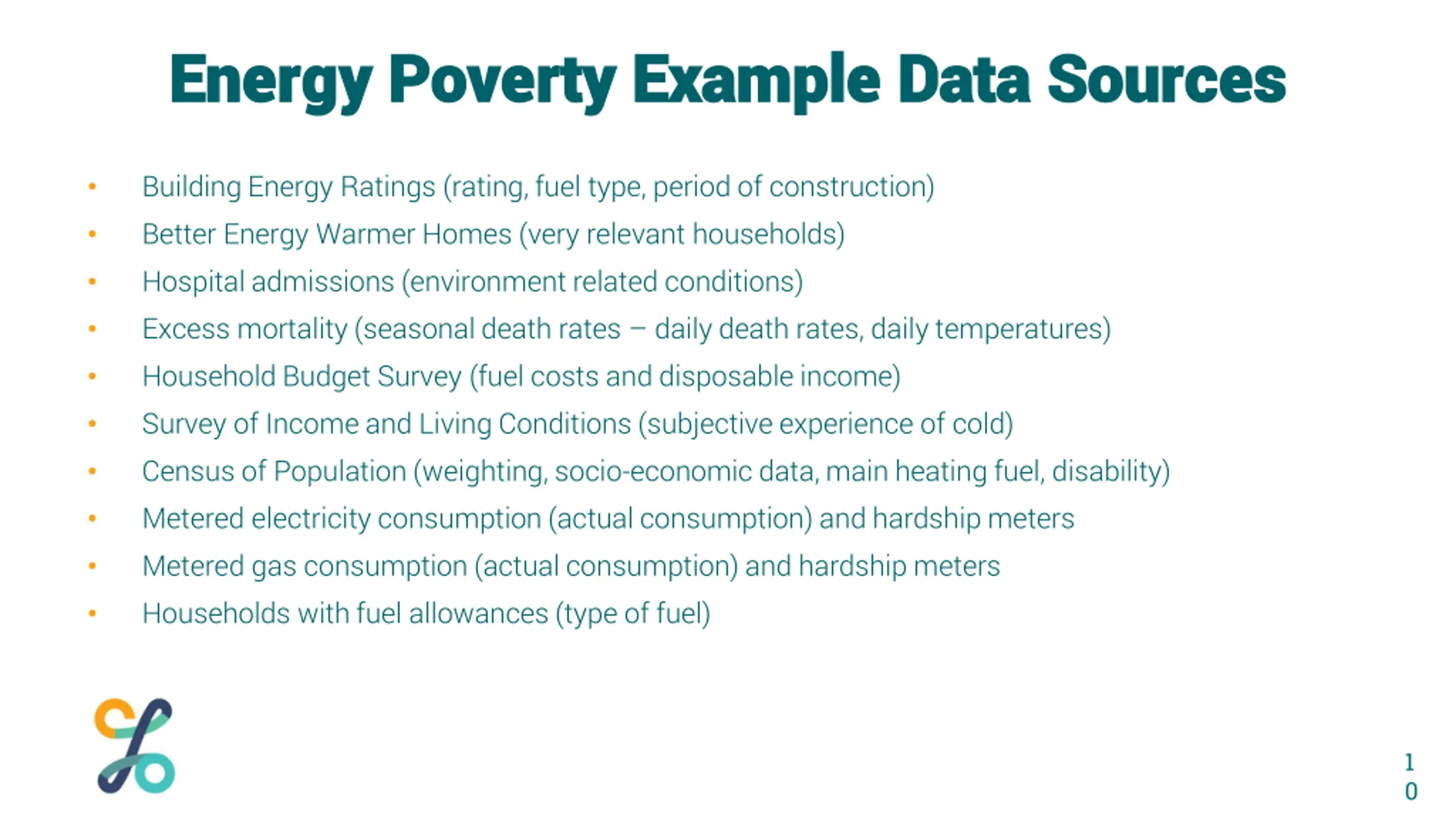 Energy Poverty Example Data Sources Energy Poverty Example Data Sources Building Energy Ratings (rating, fuel type, period of construction) Better Energy Warmer Homes (very relevant households) Hospital admissions (environment related conditions) Excess mortality (seasonal death rates daily death rates, daily temperatures) Household Budget Survey (fuel costs and disposable income) Survey of Income and Living Conditions (subjective experience of cold) Census of Population (weighting, socio-economic data, main heating fuel, disability) Metered electricity consumption (actual consumption) and hardship meters Metered gas consumption (actual consumption) and hardship meters Households with fuel allowances (type of fuel) 1 0