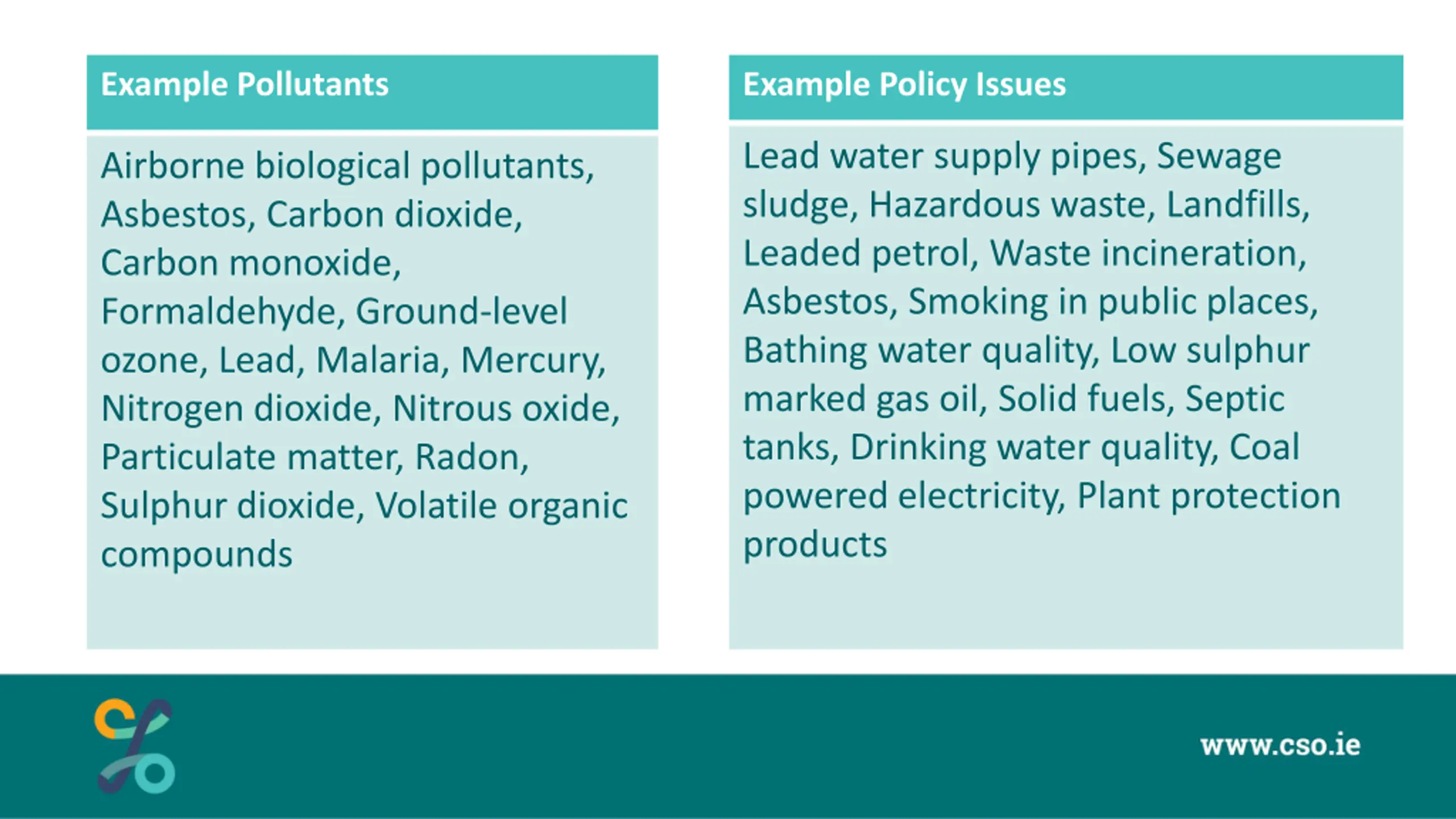 Example Pollutants Example Policy Issues Lead water supply pipes, Sewage sludge, Hazardous waste, Landfills, Leaded petrol, Waste incineration, Asbestos, Smoking in public places, Bathing water quality, Low sulphur marked gas oil, Solid fuels, Septic tanks, Drinking water quality, Coal powered electricity, Plant protection products Airborne biological pollutants, Asbestos, Carbon dioxide, Carbon monoxide, Formaldehyde, Ground-level ozone, Lead, Malaria, Mercury, Nitrogen dioxide, Nitrous oxide, Particulate matter, Radon, Sulphur dioxide, Volatile organic compounds