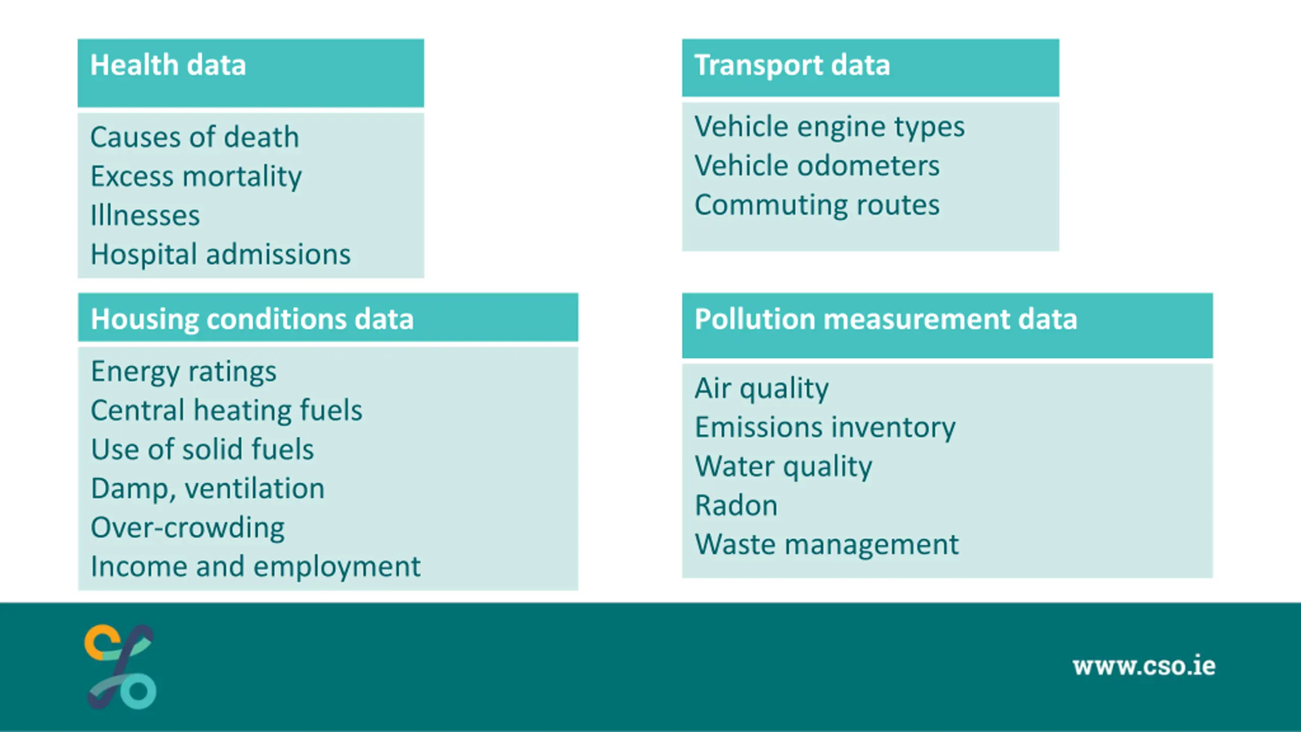 Health data Transport data Vehicle engine types Vehicle odometers Commuting routes Causes of death Excess mortality Illnesses Hospital admissions Housing conditions data Pollution measurement data Energy ratings Central heating fuels Use of solid fuels Damp, ventilation Over-crowding Income and employment Air quality Emissions inventory Water quality Radon Waste management
