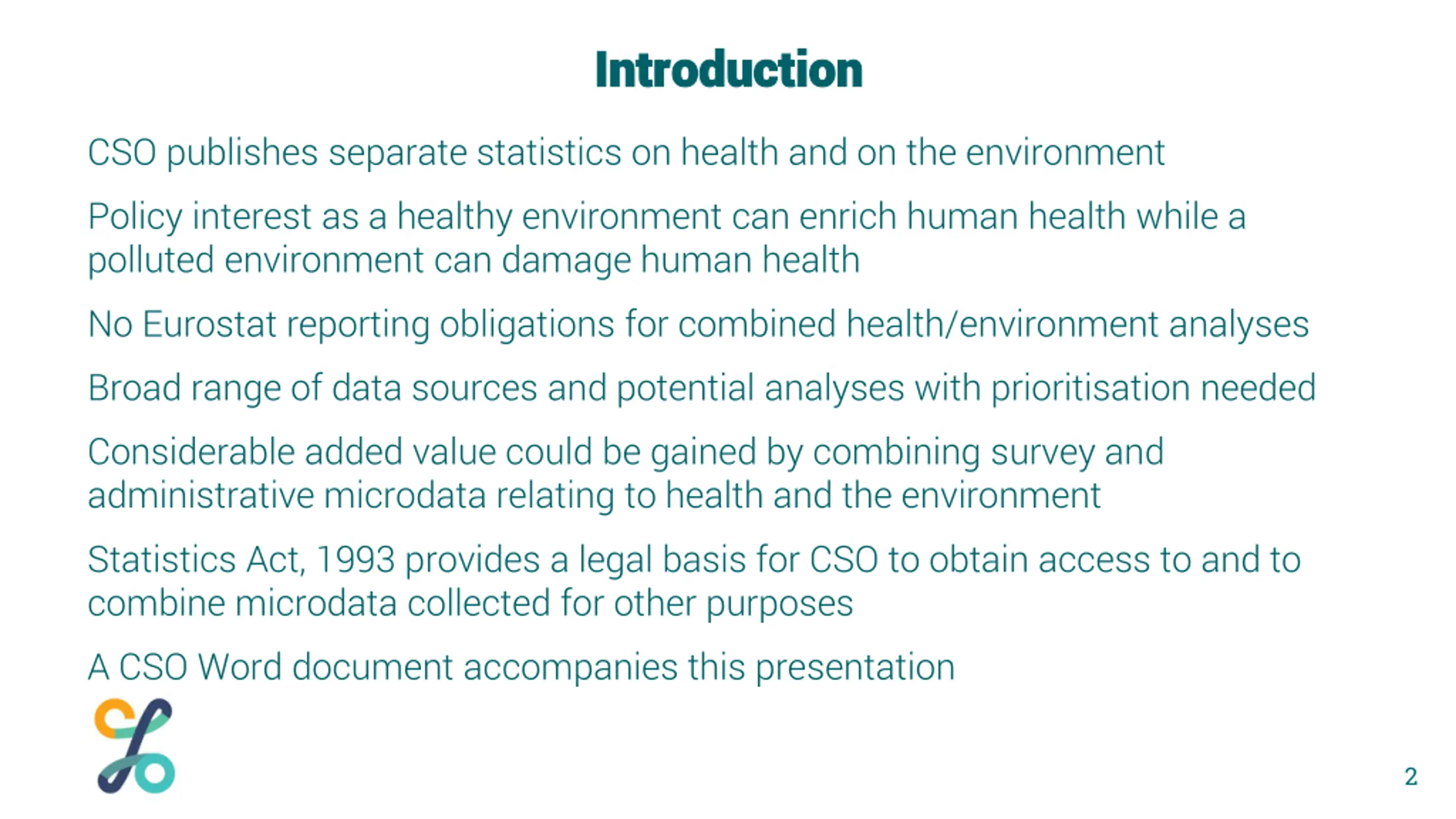 Introduction Introduction CSO publishes separate statistics on health and on the environment Policy interest as a healthy environment can enrich human health while a polluted environment can damage human health No Eurostat reporting obligations for combined health/environment analyses Broad range of data sources and potential analyses with prioritisation needed Considerable added value could be gained by combining survey and administrative microdata relating to health and the environment Statistics Act, 1993 provides a legal basis for CSO to obtain access to and to combine microdata collected for other purposes A CSO Word document accompanies this presentation 2