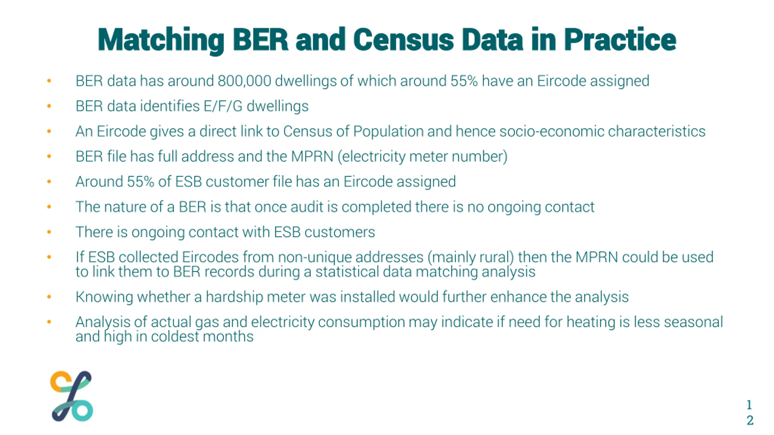 Matching BER and Census Data in Practice Matching BER and Census Data in Practice BER data has around 800,000 dwellings of which around 55% have an Eircode assigned BER data identifies E/F/G dwellings An Eircode gives a direct link to Census of Population and hence socio-economic characteristics BER file has full address and the MPRN (electricity meter number) Around 55% of ESB customer file has an Eircode assigned The nature of a BER is that once audit is completed there is no ongoing contact There is ongoing contact with ESB customers If ESB collected Eircodes from non-unique addresses (mainly rural) then the MPRN could be used to link them to BER records during a statistical data matching analysis Knowing whether a hardship meter was installed would further enhance the analysis Analysis of actual gas and electricity consumption may indicate if need for heating is less seasonal and high in coldest months 1 2