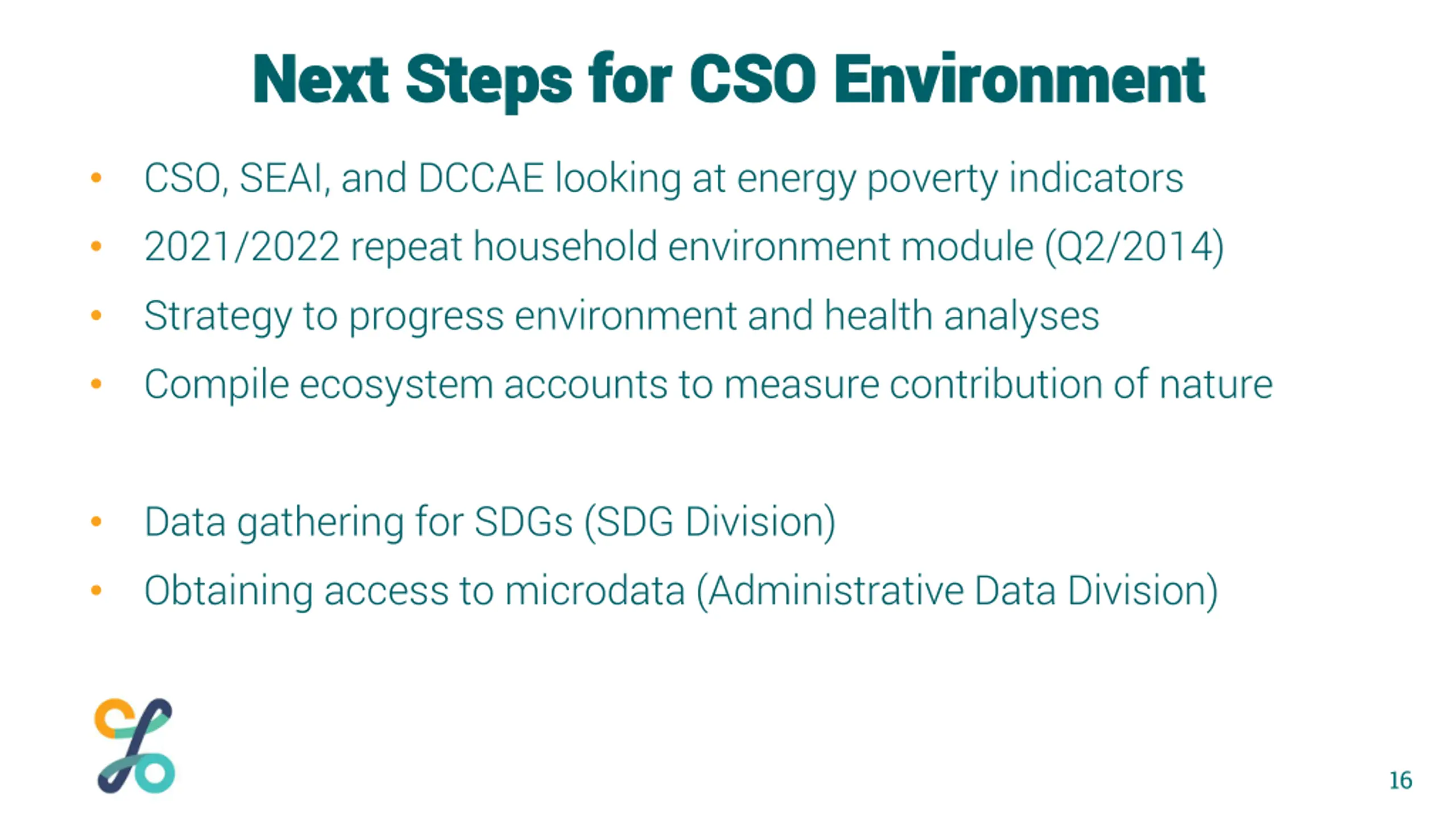 Next Steps for CSO Environment Next Steps for CSO Environment CSO, SEAI, and DCCAE looking at energy poverty indicators 2021/2022 repeat household environment module (Q2/2014) Strategy to progress environment and health analyses Compile ecosystem accounts to measure contribution of nature Data gathering for SDGs (SDG Division) Obtaining access to microdata (Administrative Data Division) 16