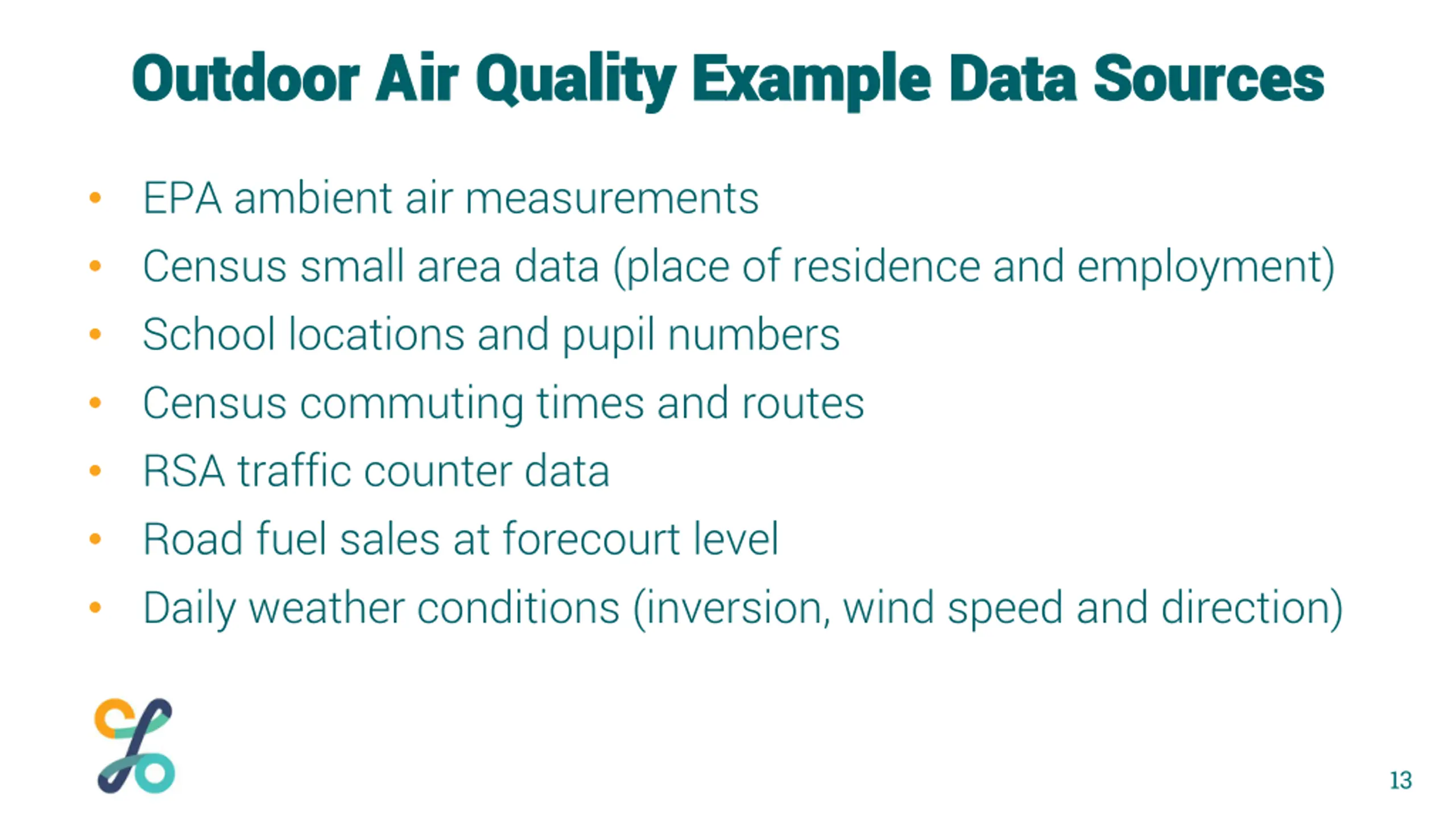 Outdoor Air Quality Example Data Sources Outdoor Air Quality Example Data Sources EPA ambient air measurements Census small area data (place of residence and employment) School locations and pupil numbers Census commuting times and routes RSA traffic counter data Road fuel sales at forecourt level Daily weather conditions (inversion, wind speed and direction) 13