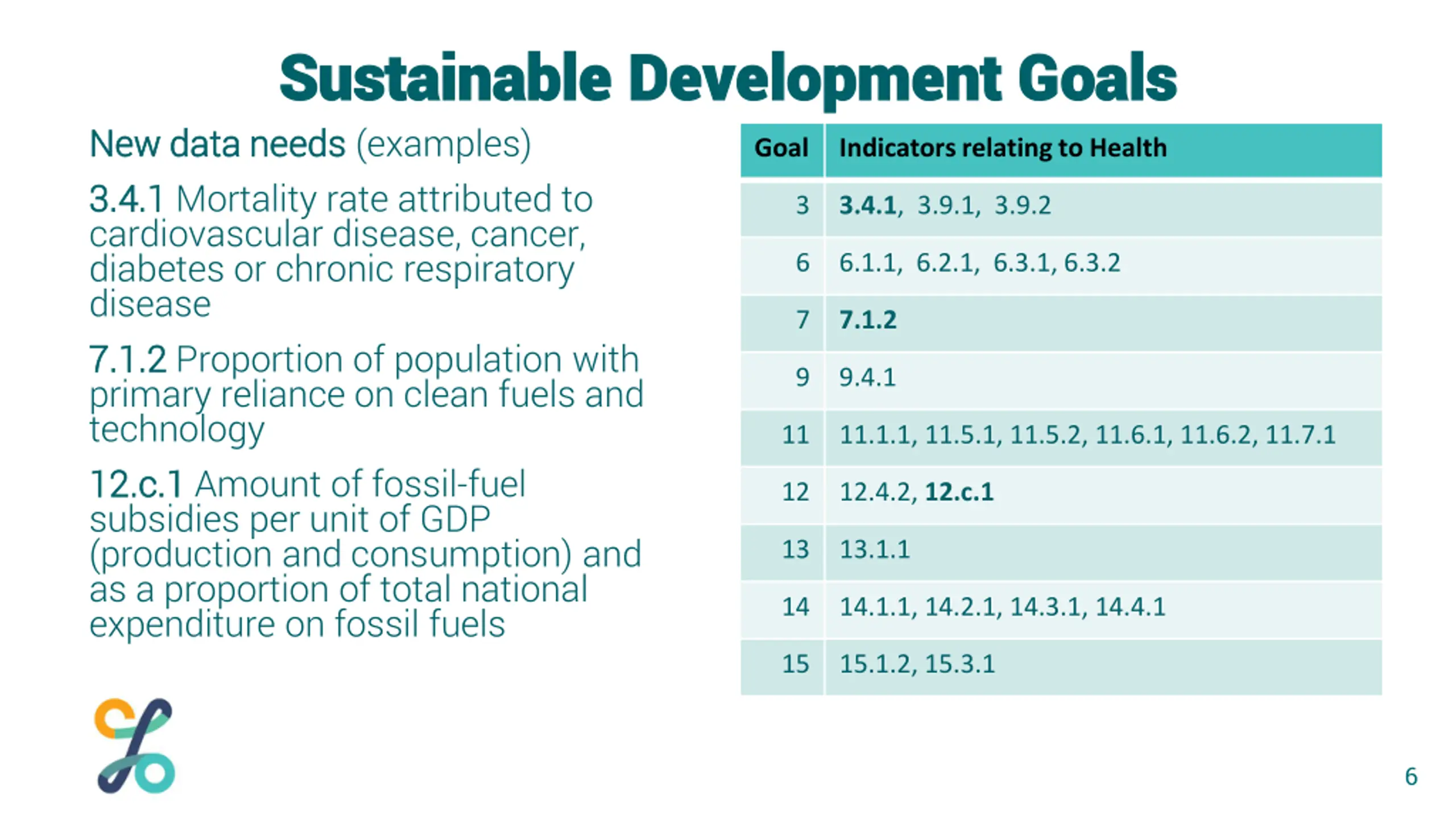 Sustainable Development Goals Sustainable Development Goals New data needs New data needs (examples) 3.4.1 3.4.1 Mortality rate attributed to cardiovascular disease, cancer, diabetes or chronic respiratory disease 7.1.2 7.1.2 Proportion of population with primary reliance on clean fuels and technology 12.c.1 12.c.1 Amount of fossil-fuel subsidies per unit of GDP (production and consumption) and as a proportion of total national expenditure on fossil fuels Goal Indicators relating to Health 3 3.4.1, 3.9.1, 3.9.2 6 6.1.1, 6.2.1, 6.3.1, 6.3.2 7 7.1.2 9 9.4.1 11 11.1.1, 11.5.1, 11.5.2, 11.6.1, 11.6.2, 11.7.1 12 12.4.2, 12.c.1 13 13.1.1 14 14.1.1, 14.2.1, 14.3.1, 14.4.1 15 15.1.2, 15.3.1 6