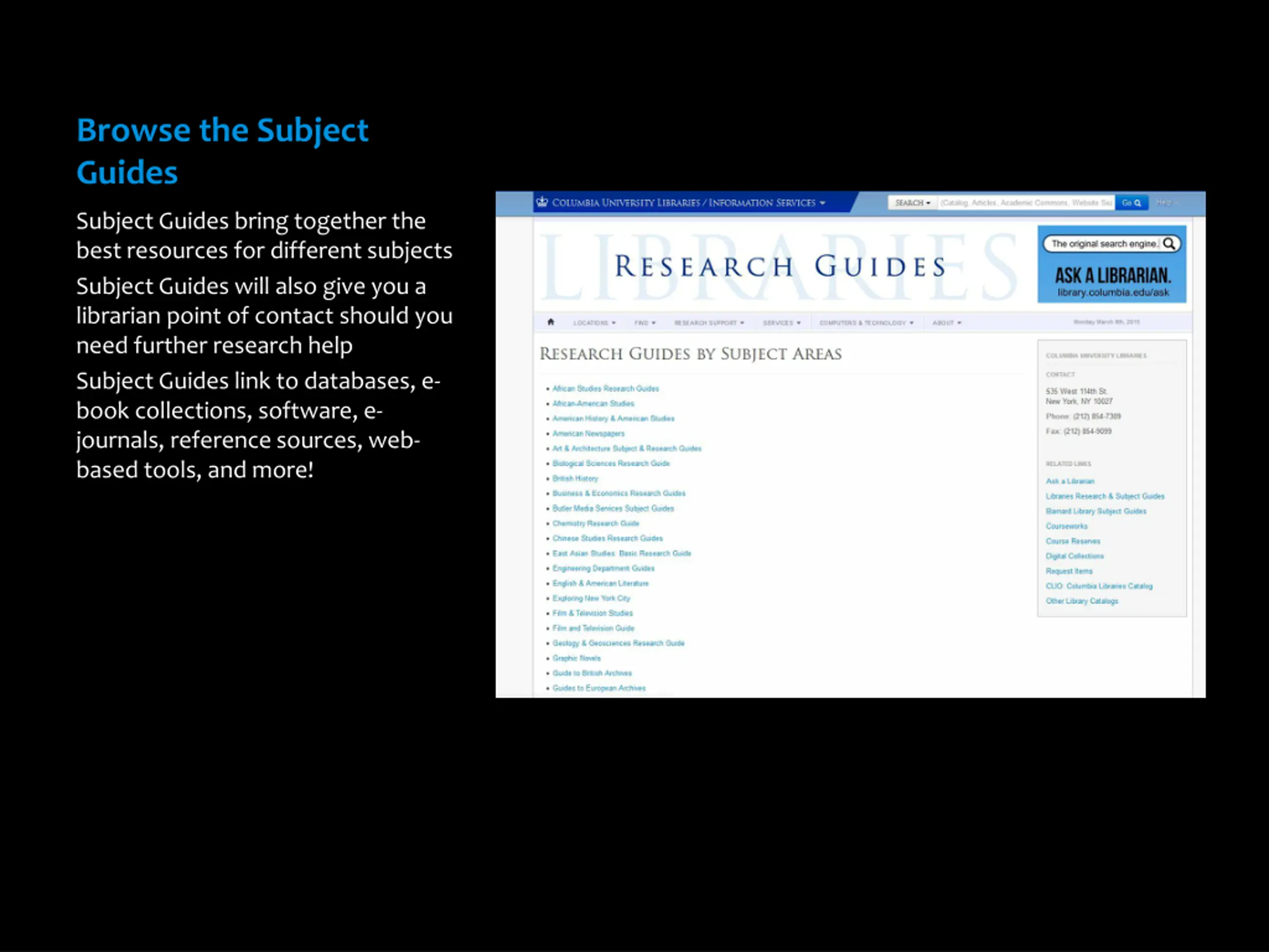 Browse the Subject Guides Subject Guides bring together the best resources for different subjects Subject Guides will also give you a librarian point of contact should you need further research help Subject Guides link to databases, e- book collections, software, e- journals, reference sources, web- based tools, and more!