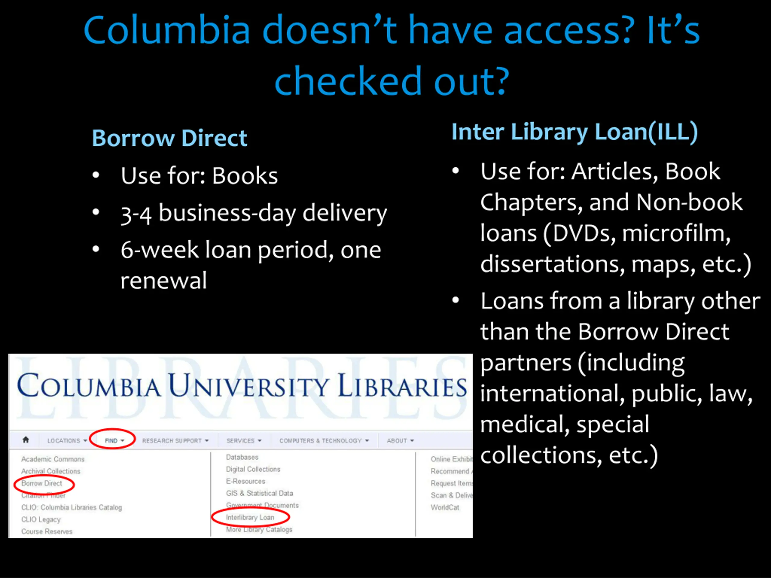 Columbia doesnt have access? Its checked out? Inter Library Loan(ILL) Use for: Articles, Book Chapters, and Non-book loans (DVDs, microfilm, dissertations, maps, etc.) Loans from a library other than the Borrow Direct partners (including international, public, law, medical, special collections, etc.) Borrow Direct Use for: Books 3-4 business-day delivery 6-week loan period, one renewal