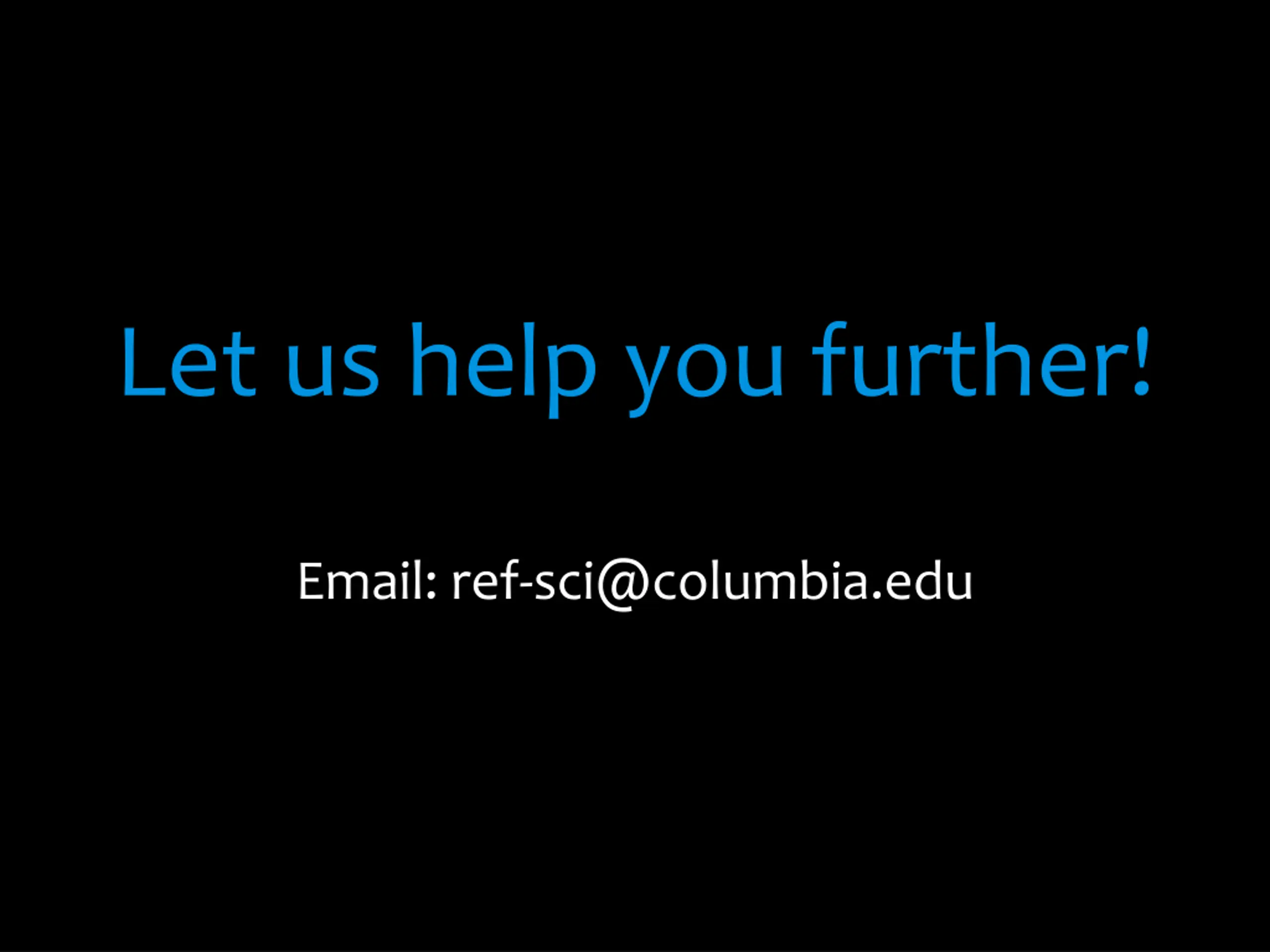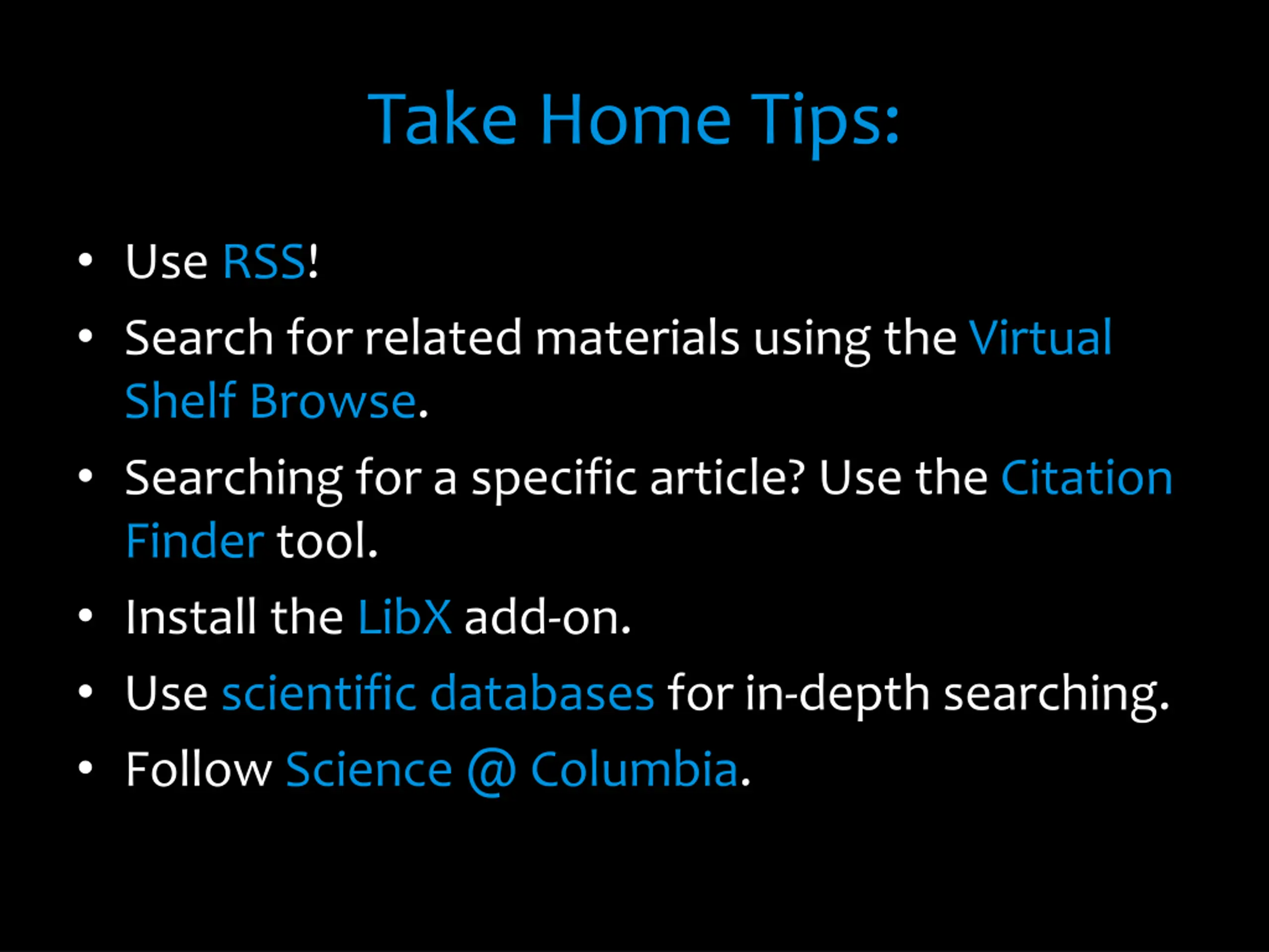 Take Home Tips: Use RSS! Search for related materials using the Virtual Shelf Browse. Searching for a specific article? Use the Citation Finder tool. Install the LibX add-on. Use scientific databases for in-depth searching. Follow Science @ Columbia.