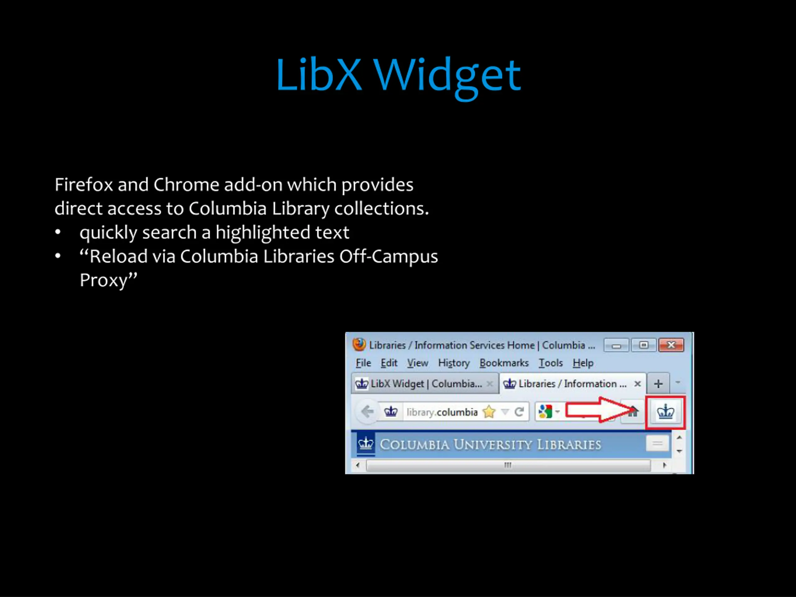 LibX Widget Firefox and Chrome add-on which provides direct access to Columbia Library collections. quickly search a highlighted text Reload via Columbia Libraries Off-Campus Proxy file