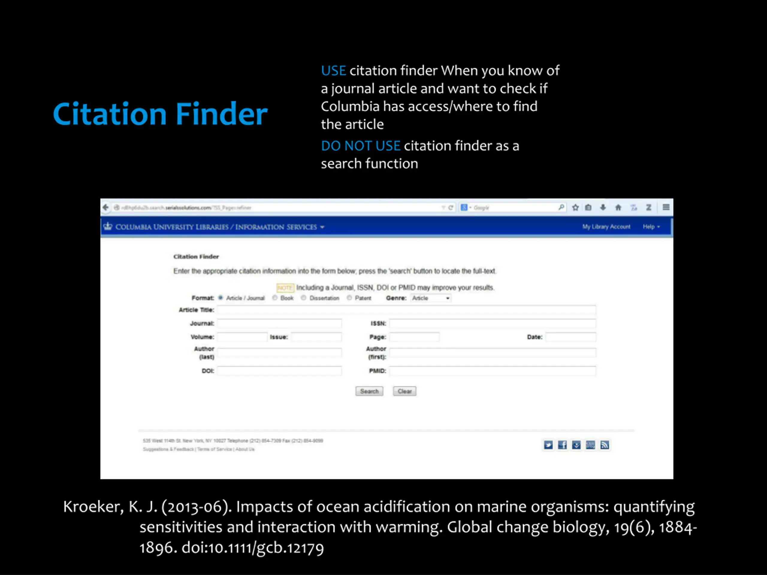 USE citation finder When you know of a journal article and want to check if Columbia has access/where to find the article DO NOT USE citation finder as a search function Citation Finder Kroeker, K. J. (2013-06). Impacts of ocean acidification on marine organisms: quantifying sensitivities and interaction with warming. Global change biology, 19(6), 1884- 1896. doi:10.1111/gcb.12179