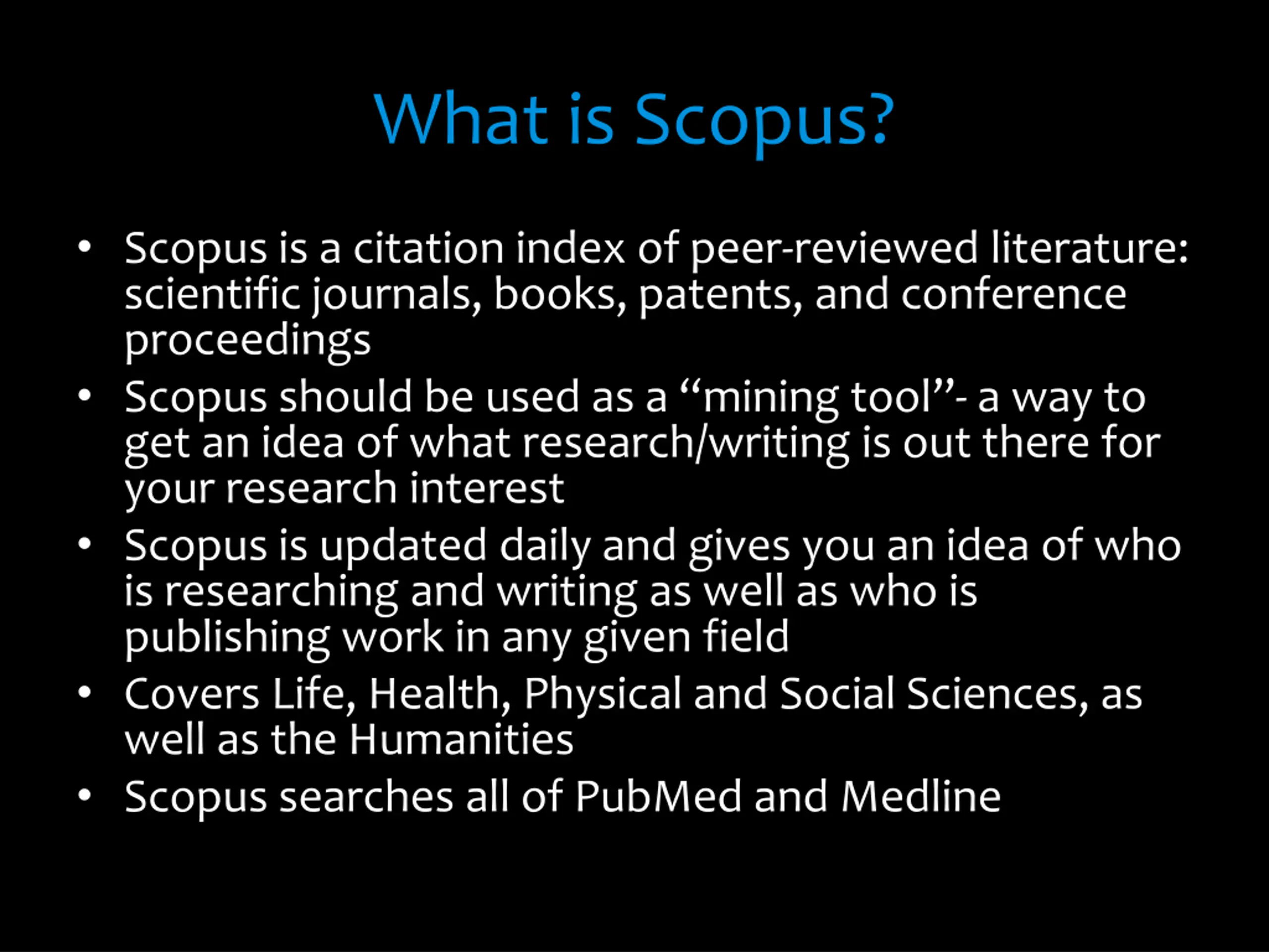 What is Scopus? Scopus is a citation index of peer-reviewed literature: scientific journals, books, patents, and conference proceedings Scopus should be used as a mining tool - a way to get an idea of what research/writing is out there for your research interest Scopus is updated daily and gives you an idea of who is researching and writing as well as who is publishing work in any given field Covers Life, Health, Physical and Social Sciences, as well as the Humanities Scopus searches all of PubMed and Medline