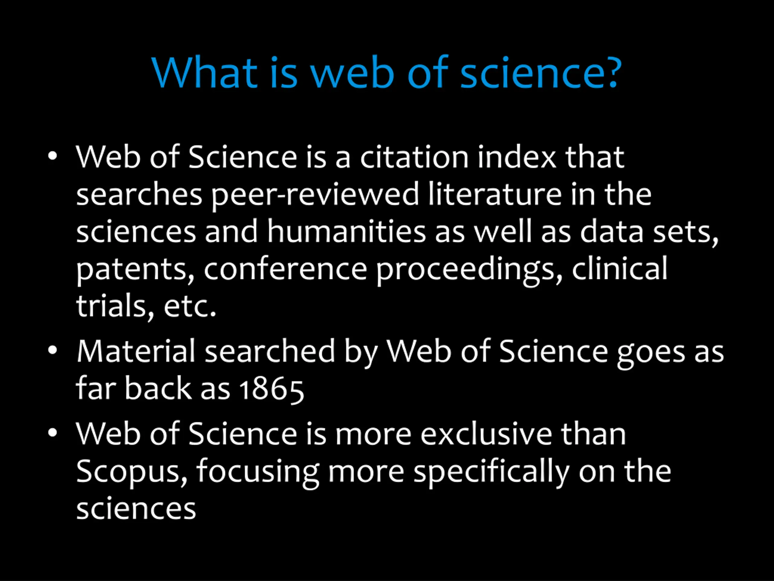 What is web of science? Web of Science is a citation index that searches peer-reviewed literature in the sciences and humanities as well as data sets, patents, conference proceedings, clinical trials, etc. Material searched by Web of Science goes as far back as 1865 Web of Science is more exclusive than Scopus, focusing more specifically on the sciences
