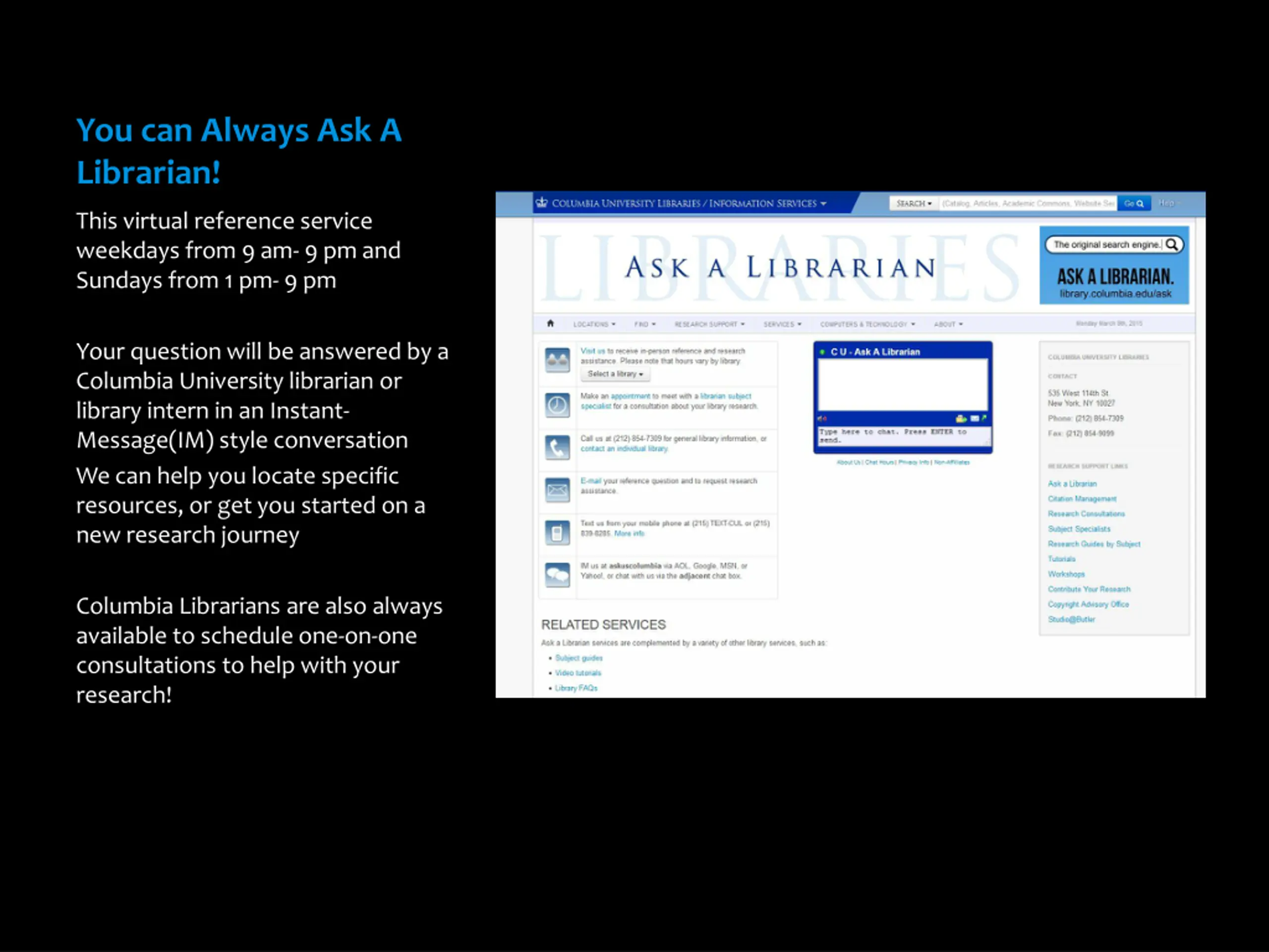 You can Always Ask A Librarian! This virtual reference service weekdays from 9 am- 9 pm and Sundays from 1 pm- 9 pm Your question will be answered by a Columbia University librarian or library intern in an Instant- Message(IM) style conversation We can help you locate specific resources, or get you started on a new research journey Columbia Librarians are also always available to schedule one-on-one consultations to help with your research!