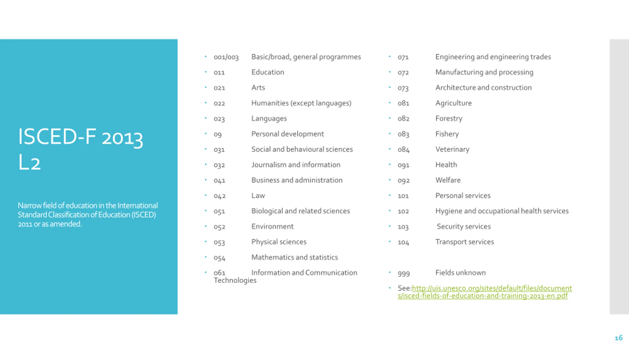 001/003 071 Basic/broad, general programmes Engineering and engineering trades 011 072 Education Manufacturing and processing 021 073 Arts Architecture and construction 022 081 Humanities (except languages) Agriculture 023 082 Languages Forestry ISCED-F 2013 L2 09 083 Personal development Fishery 031 084 Social and behavioural sciences Veterinary 032 091 Journalism and information Health 041 092 Business and administration Welfare 042 101 Law Personal services Narrow field of education in the International Standard Classification of Education (ISCED) 2011 or as amended. 051 102 Biological and related sciences Hygiene and occupational health services 052 103 Environment Security services 053 104 Physical sciences Transport services 054 Mathematics and statistics 061 Technologies 999 Information and Communication Fields unknown See:http://uis.unesco.org/sites/default/files/document s/isced-fields-of-education-and-training-2013-en.pdf 16