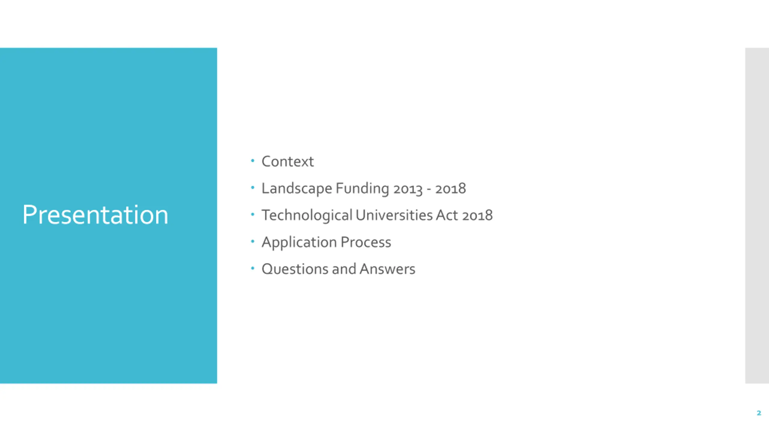 Context Landscape Funding 2013 - 2018 Presentation Technological Universities Act 2018 Application Process Questions and Answers 2