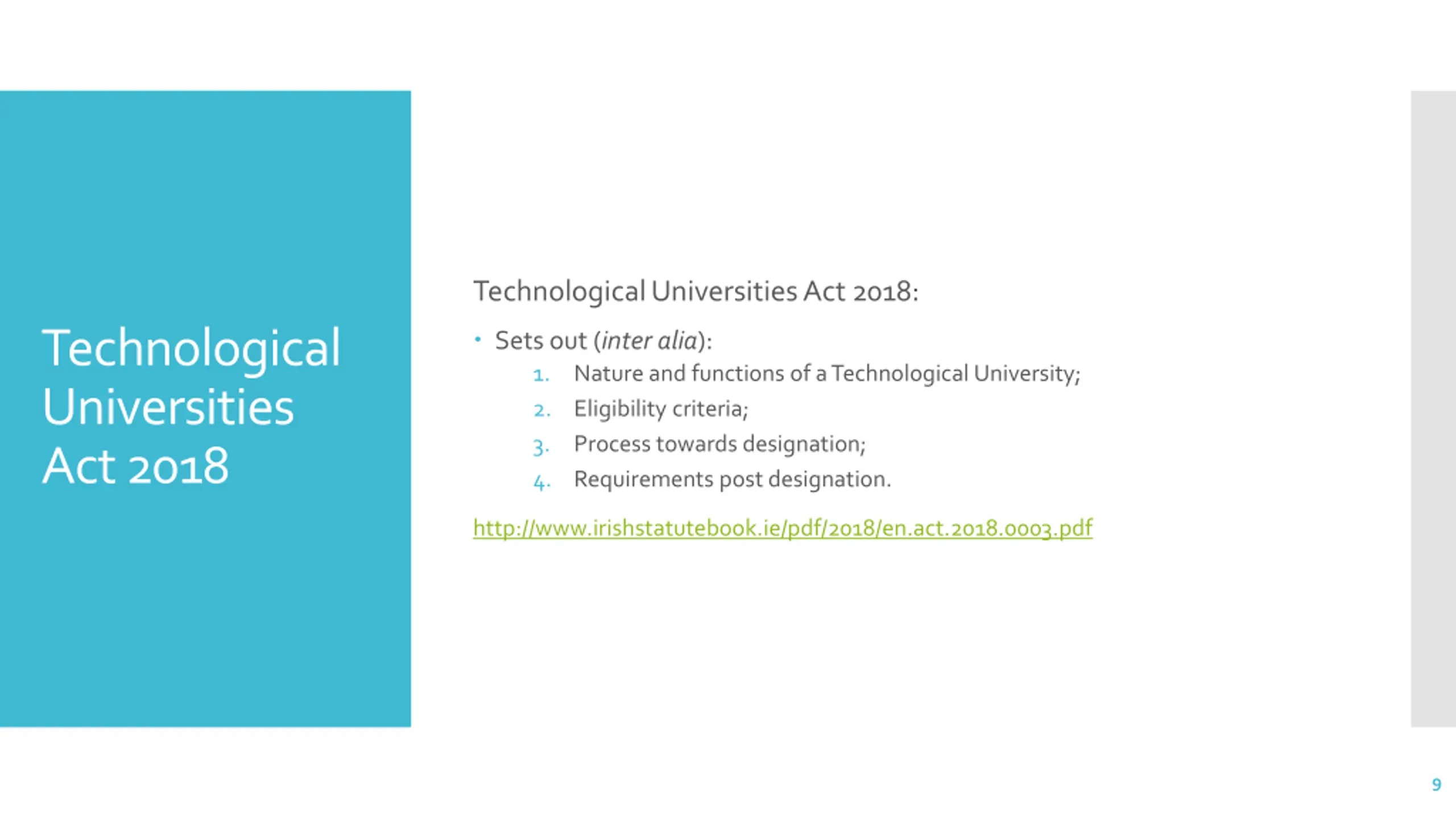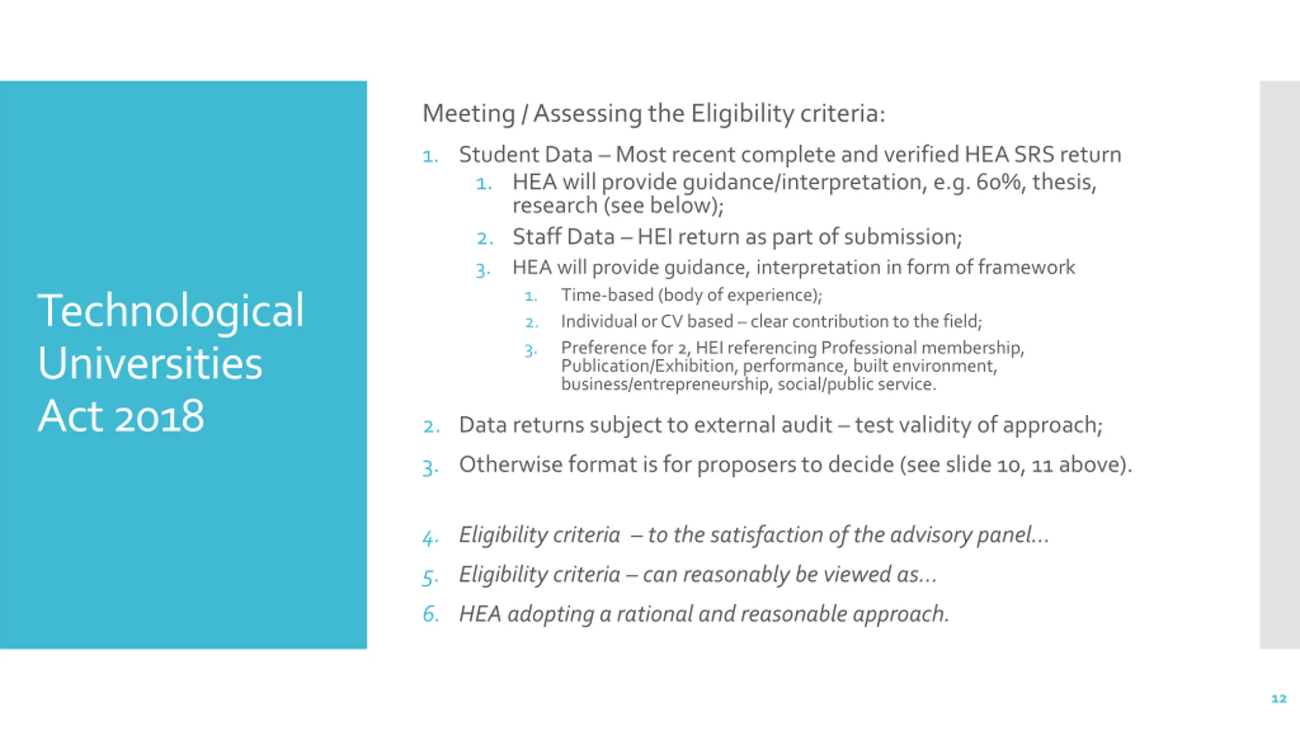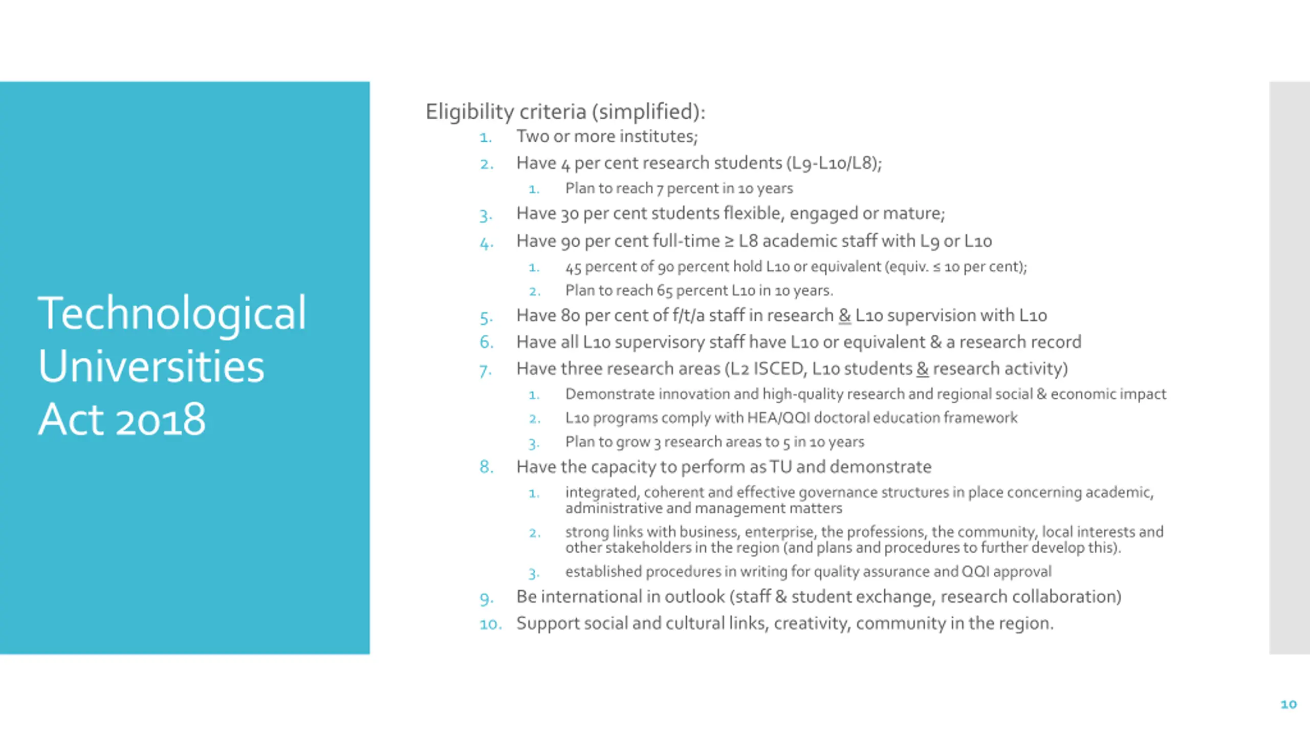 Eligibility criteria (simplified): 1. Two or more institutes; 2. Have 4 per cent research students (L9-L10/L8); 1. Plan to reach 7 percent in 10 years 3. Have 30 per cent students flexible, engaged or mature; 4. Have 90 per cent full-time L8 academic staff with L9 or L10 1. 45 percent of 90 percent hold L10 or equivalent (equiv. 10 per cent); 2. Plan to reach 65 percent L10 in 10 years. 5. Have 80 per cent of f/t/a staff in research & L10 supervision with L10 6. Have all L10 supervisory staff have L10 or equivalent & a research record 7. Have three research areas (L2 ISCED, L10 students & research activity) 1. Demonstrate innovation and high-quality research and regional social & economic impact 2. L10 programs comply with HEA/QQI doctoral education framework 3. Plan to grow 3 research areas to 5 in 10 years 8. Have the capacity to perform as TU and demonstrate 1. integrated, coherent and effective governance structures in place concerning academic, administrative and management matters 2. strong links with business, enterprise, the professions, the community, local interests and other stakeholders in the region (and plans and procedures to further develop this). 3. established procedures in writing for quality assurance and QQI approval 9. Be international in outlook (staff & student exchange, research collaboration) 10. Support social and cultural links, creativity, community in the region. Technological Universities Act 2018 10