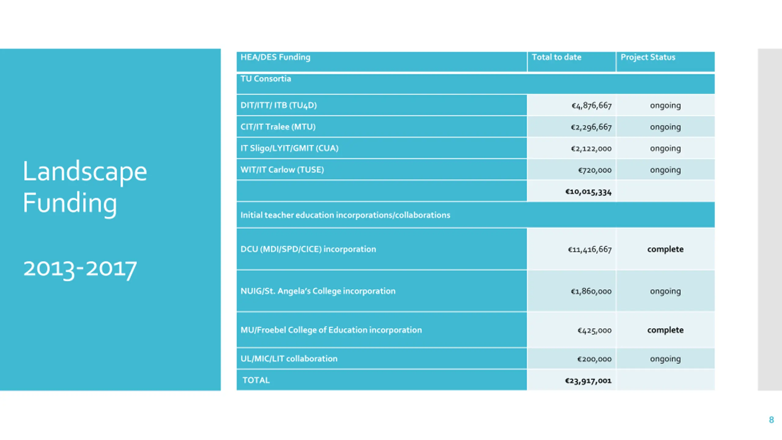 HEA/DES Funding Total to date Project Status TU Consortia DIT/ITT/ ITB (TU4D) 4,876,667 ongoing CIT/IT Tralee (MTU) 2,296,667 ongoing IT Sligo/LYIT/GMIT (CUA) 2,122,000 ongoing Landscape Funding WIT/IT Carlow (TUSE) 720,000 ongoing 10,015,334 Initial teacher education incorporations/collaborations DCU (MDI/SPD/CICE) incorporation 11,416,667 complete 2013-2017 NUIG/St. Angela s College incorporation 1,860,000 ongoing MU/Froebel College of Education incorporation 425,000 complete UL/MIC/LIT collaboration 200,000 ongoing TOTAL 23,917,001 8