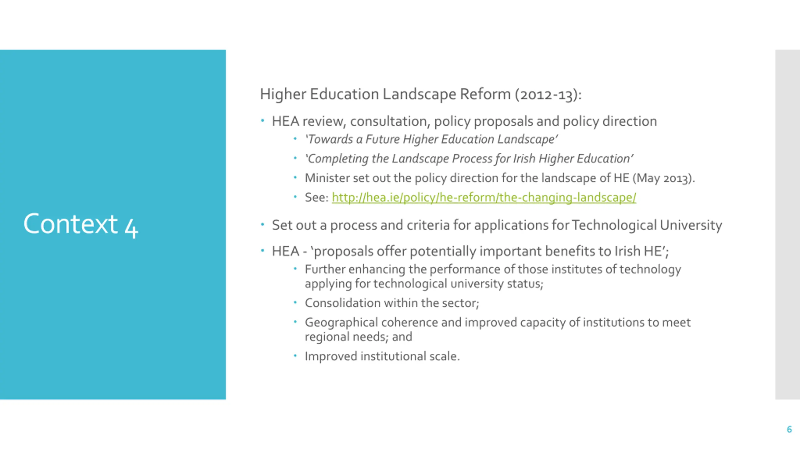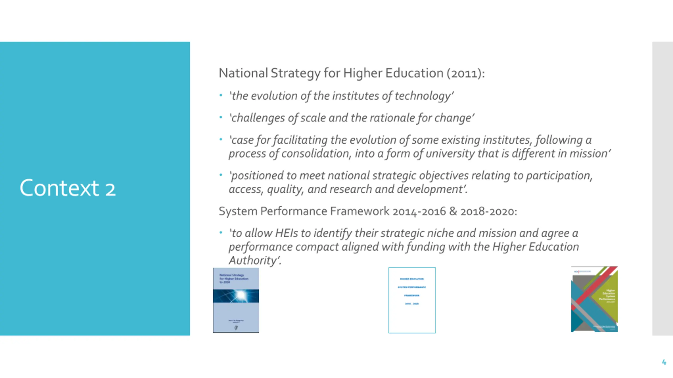 National Strategy for Higher Education (2011): the evolution of the institutes of technology challenges of scale and the rationale for change case for facilitating the evolution of some existing institutes, following a process of consolidation, into a form of university that is different in mission positioned to meet national strategic objectives relating to participation, access, quality, and research and development . Context 2 System Performance Framework 2014-2016 & 2018-2020: to allow HEIs to identify their strategic niche and mission and agree a performance compact aligned with funding with the Higher Education Authority . 4
