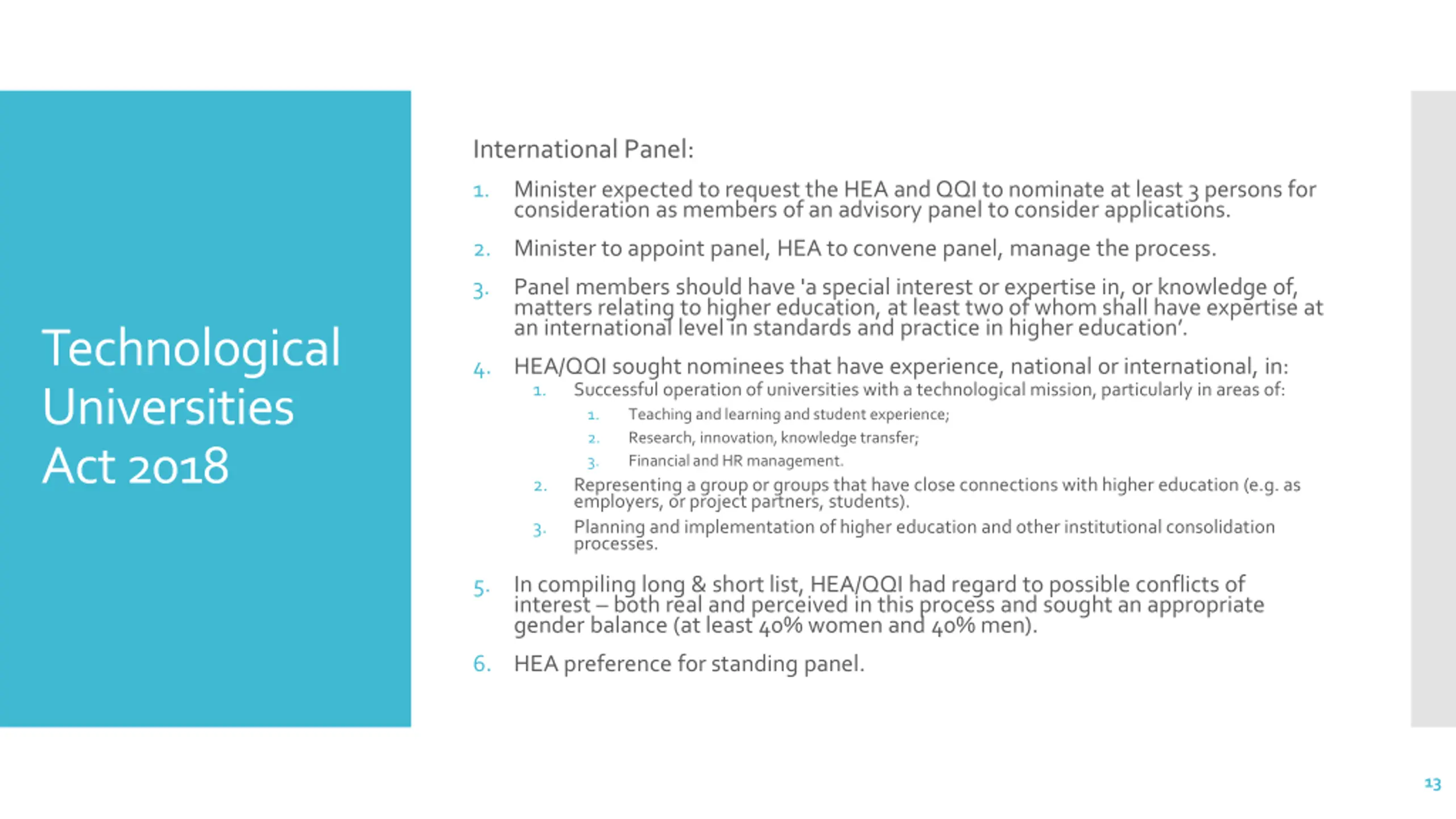 International Panel: 1. Minister expected to request the HEA and QQI to nominate at least 3 persons for consideration as members of an advisory panel to consider applications. 2. Minister to appoint panel, HEA to convene panel, manage the process. 3. Panel members should have 'a special interest or expertise in, or knowledge of, matters relating to higher education, at least two of whom shall have expertise at an international level in standards and practice in higher education . Technological Universities Act 2018 4. HEA/QQI sought nominees that have experience, national or international, in: 1. Successful operation of universities with a technological mission, particularly in areas of: 1. Teaching and learning and student experience; 2. Research, innovation, knowledge transfer; 3. Financial and HR management. 2. Representing a group or groups that have close connections with higher education (e.g. as employers, or project partners, students). 3. Planning and implementation of higher education and other institutional consolidation processes. 5. In compiling long & short list, HEA/QQI had regard to possible conflicts of interest both real and perceived in this process and sought an appropriate gender balance (at least 40% women and 40% men). 6. HEA preference for standing panel. 13