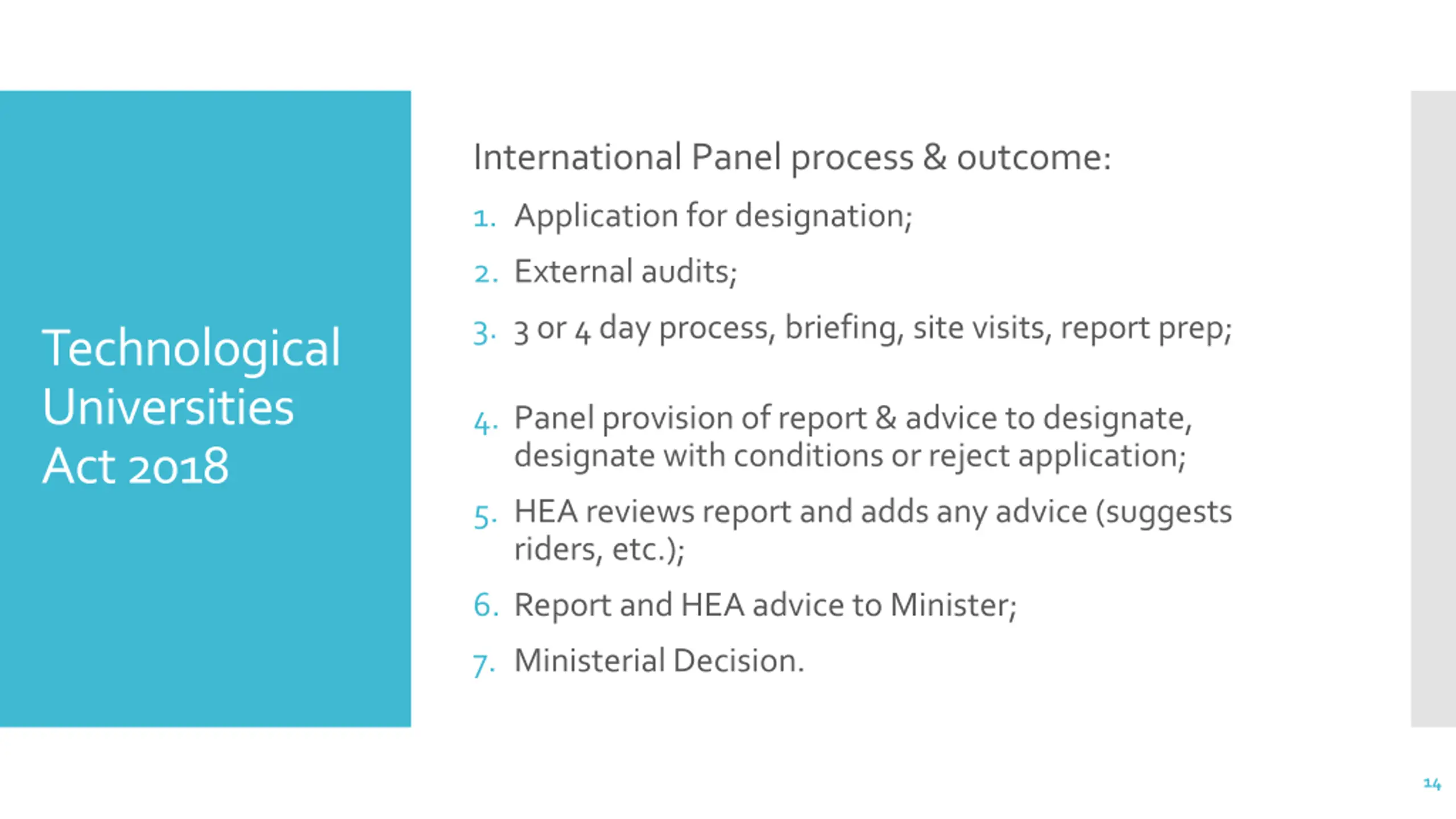 International Panel process & outcome: 1. Application for designation; 2. External audits; 3. 3 or 4 day process, briefing, site visits, report prep; Technological Universities Act 2018 4. Panel provision of report & advice to designate, designate with conditions or reject application; 5. HEA reviews report and adds any advice (suggests riders, etc.); 6. Report and HEA advice to Minister; 7. Ministerial Decision. 14
