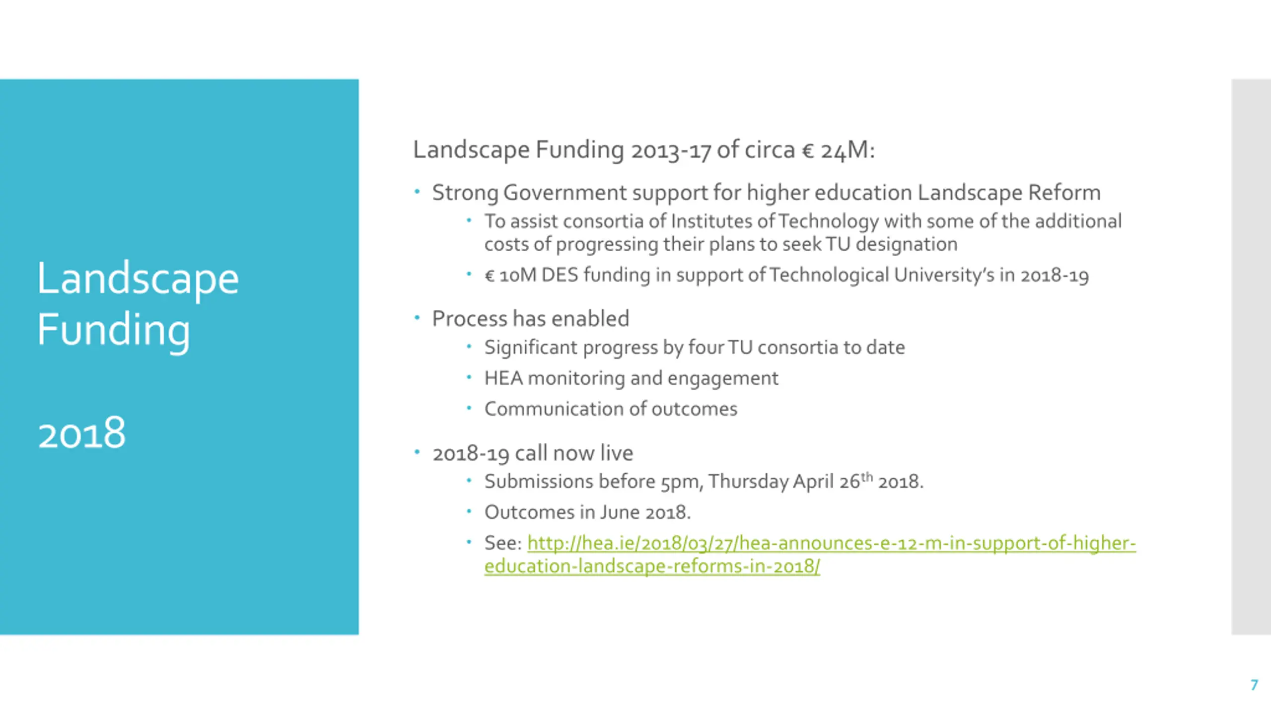 Higher Education Landscape Reform (2012-13): HEA review, consultation, policy proposals and policy direction Towards a Future Higher Education Landscape Completing the Landscape Process for Irish Higher Education Minister set out the policy direction for the landscape of HE (May 2013). See: http://hea.ie/policy/he-reform/the-changing-landscape/ Context 4 Set out a process and criteria for applications for Technological University HEA - proposals offer potentially important benefits to Irish HE ; Further enhancing the performance of those institutes of technology applying for technological university status; Consolidation within the sector; Geographical coherence and improved capacity of institutions to meet regional needs; and Improved institutional scale. 6