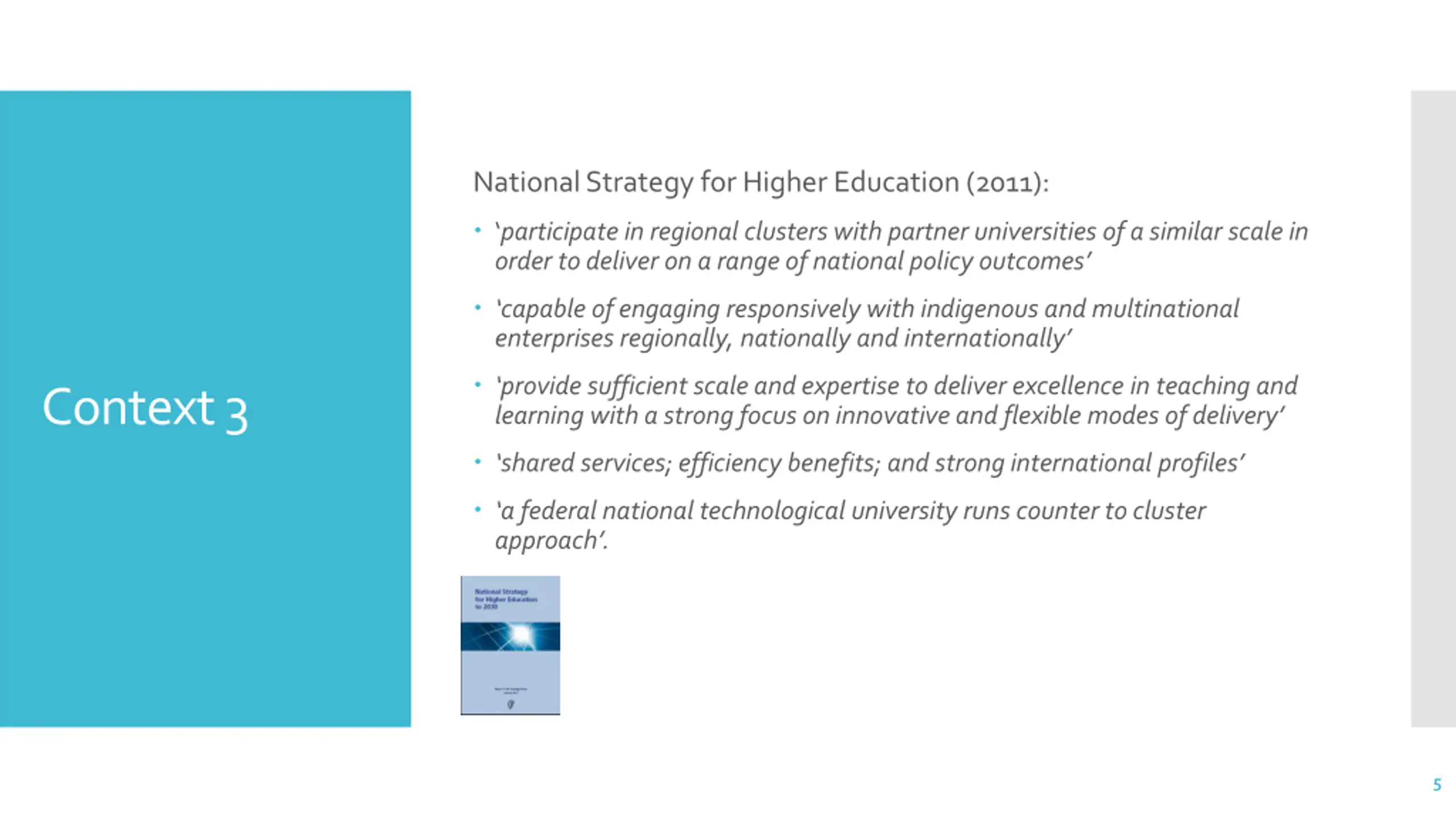 National Strategy for Higher Education (2011): participate in regional clusters with partner universities of a similar scale in order to deliver on a range of national policy outcomes capable of engaging responsively with indigenous and multinational enterprises regionally, nationally and internationally provide sufficient scale and expertise to deliver excellence in teaching and learning with a strong focus on innovative and flexible modes of delivery Context 3 shared services; efficiency benefits; and strong international profiles a federal national technological university runs counter to cluster approach . 5
