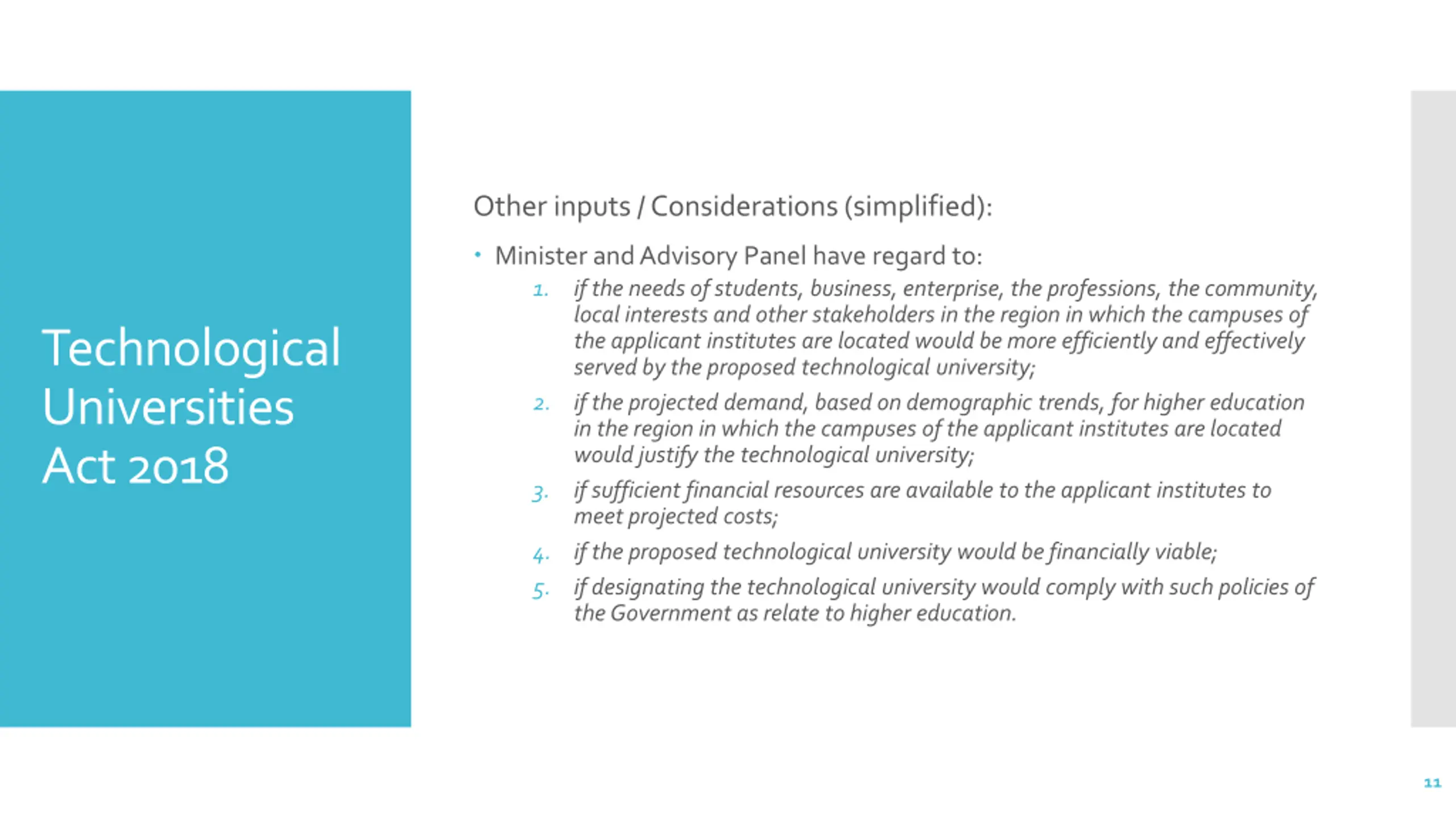 Other inputs / Considerations (simplified): Minister and Advisory Panel have regard to: 1. if the needs of students, business, enterprise, the professions, the community, local interests and other stakeholders in the region in which the campuses of the applicant institutes are located would be more efficiently and effectively served by the proposed technological university; 2. if the projected demand, based on demographic trends, for higher education in the region in which the campuses of the applicant institutes are located would justify the technological university; 3. if sufficient financial resources are available to the applicant institutes to meet projected costs; 4. if the proposed technological university would be financially viable; 5. if designating the technological university would comply with such policies of the Government as relate to higher education. Technological Universities Act 2018 11