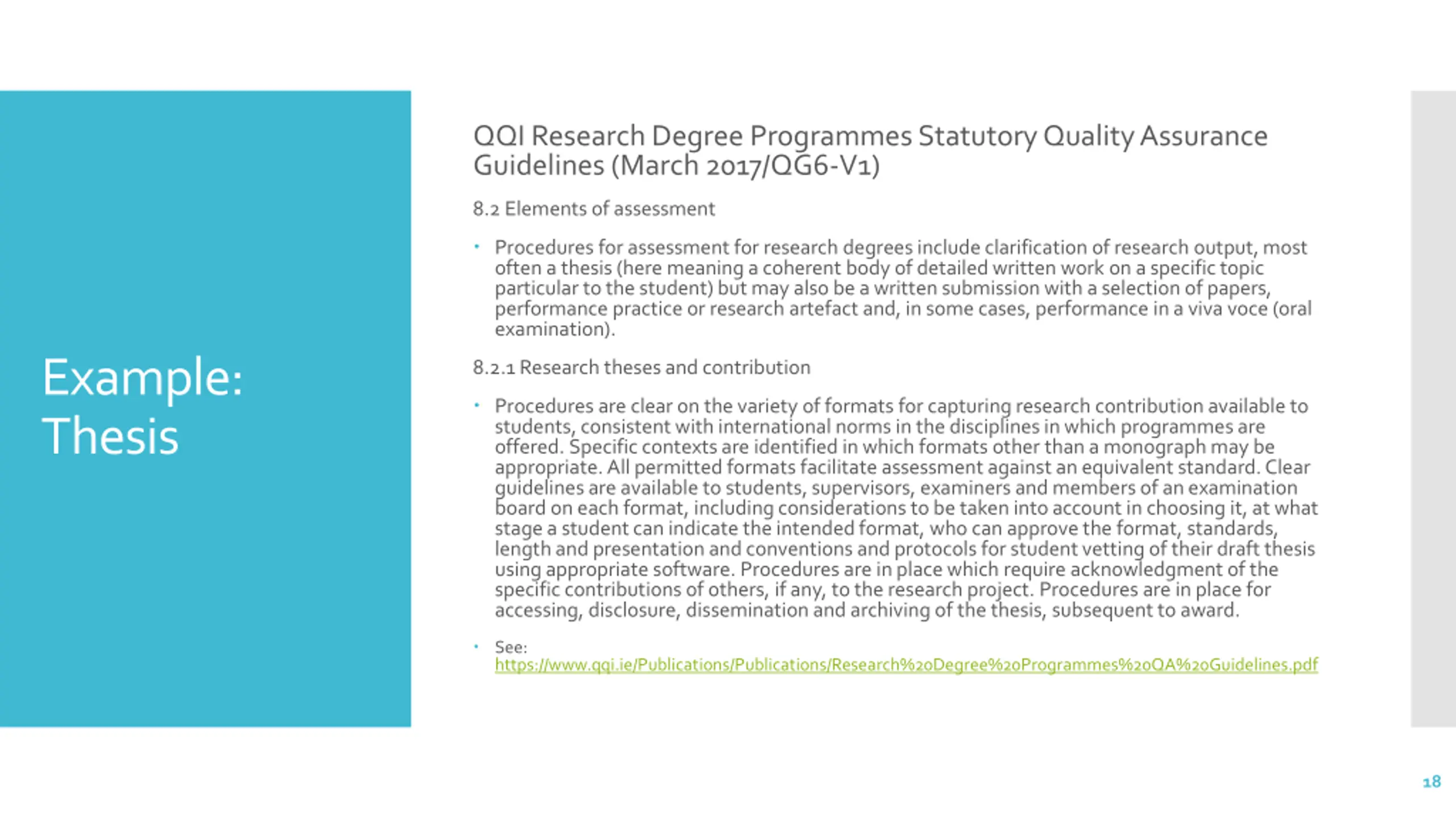 QQI Research Degree Programmes Statutory Quality Assurance Guidelines (March 2017/QG6-V1) 8.2 Elements of assessment Procedures for assessment for research degrees include clarification of research output, most often a thesis (here meaning a coherent body of detailed written work on a specific topic particular to the student) but may also be a written submission with a selection of papers, performance practice or research artefact and, in some cases, performance in a viva voce (oral examination). Example: Thesis 8.2.1 Research theses and contribution Procedures are clear on the variety of formats for capturing research contribution available to students, consistent with international norms in the disciplines in which programmes are offered. Specific contexts are identified in which formats other than a monograph may be appropriate. All permitted formats facilitate assessment against an equivalent standard. Clear guidelines are available to students, supervisors, examiners and members of an examination board on each format, including considerations to be taken into account in choosing it, at what stage a student can indicate the intended format, who can approve the format, standards, length and presentation and conventions and protocols for student vetting of their draft thesis using appropriate software. Procedures are in place which require acknowledgment of the specific contributions of others, if any, to the research project. Procedures are in place for accessing, disclosure, dissemination and archiving of the thesis, subsequent to award. See: https://www.qqi.ie/Publications/Publications/Research%20Degree%20Programmes%20QA%20Guidelines.pdf 18