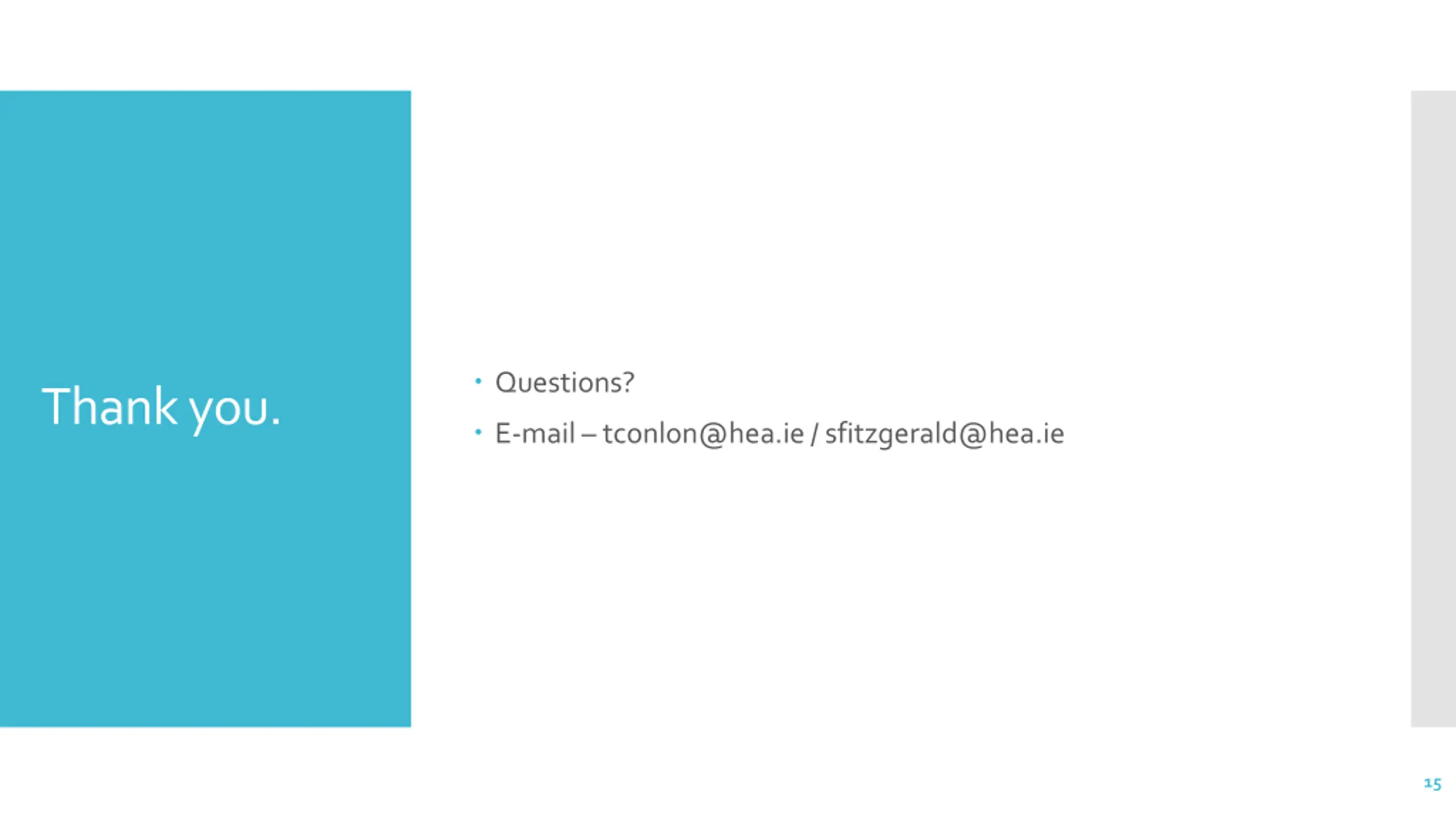 Questions? Thank you. E-mail tconlon@hea.ie / sfitzgerald@hea.ie 15