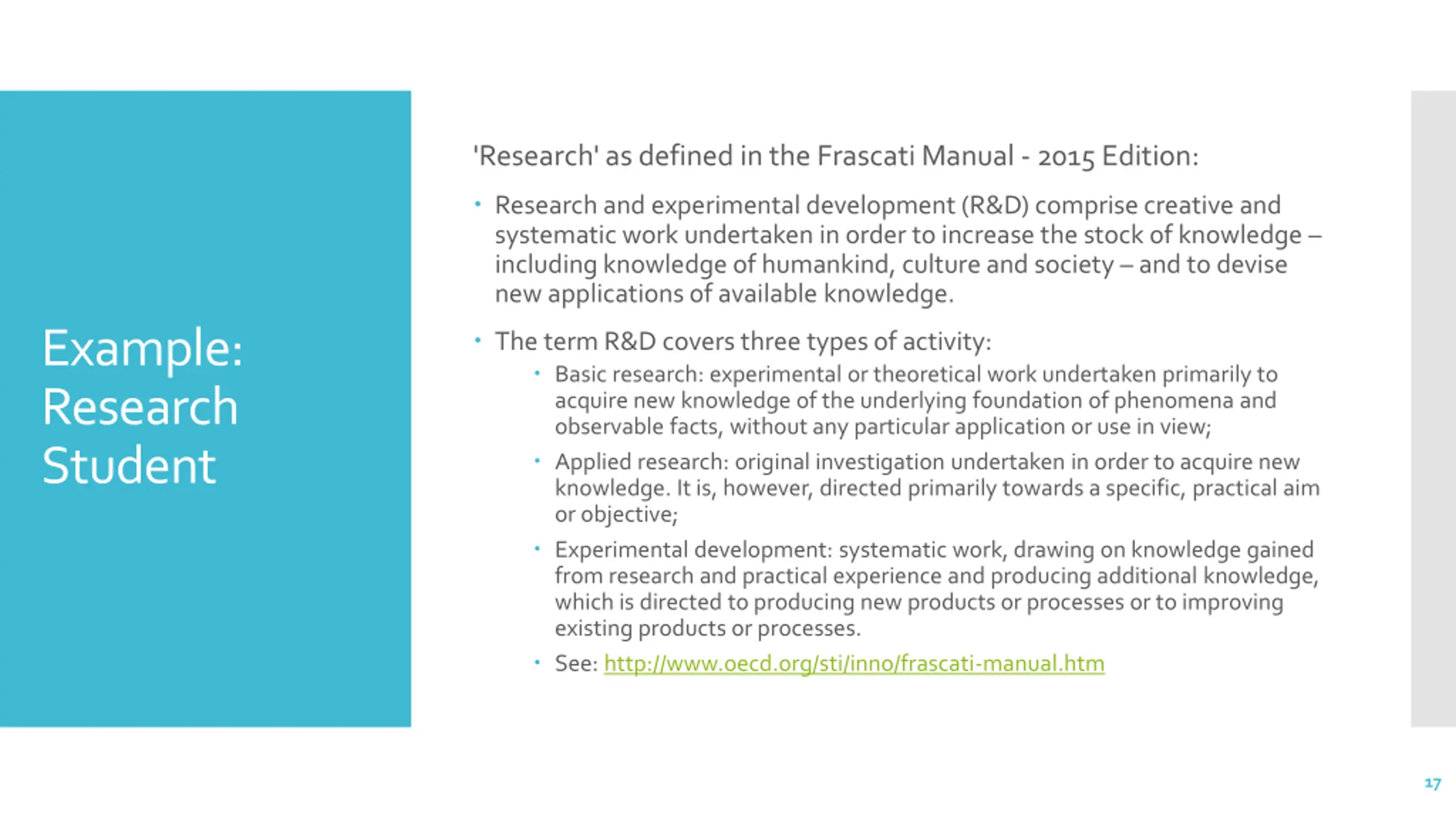 'Research' as defined in the Frascati Manual - 2015 Edition: Research and experimental development (R&D) comprise creative and systematic work undertaken in order to increase the stock of knowledge including knowledge of humankind, culture and society and to devise new applications of available knowledge. Example: Research Student The term R&D covers three types of activity: Basic research: experimental or theoretical work undertaken primarily to acquire new knowledge of the underlying foundation of phenomena and observable facts, without any particular application or use in view; Applied research: original investigation undertaken in order to acquire new knowledge. It is, however, directed primarily towards a specific, practical aim or objective; Experimental development: systematic work, drawing on knowledge gained from research and practical experience and producing additional knowledge, which is directed to producing new products or processes or to improving existing products or processes. See: http://www.oecd.org/sti/inno/frascati-manual.htm 17