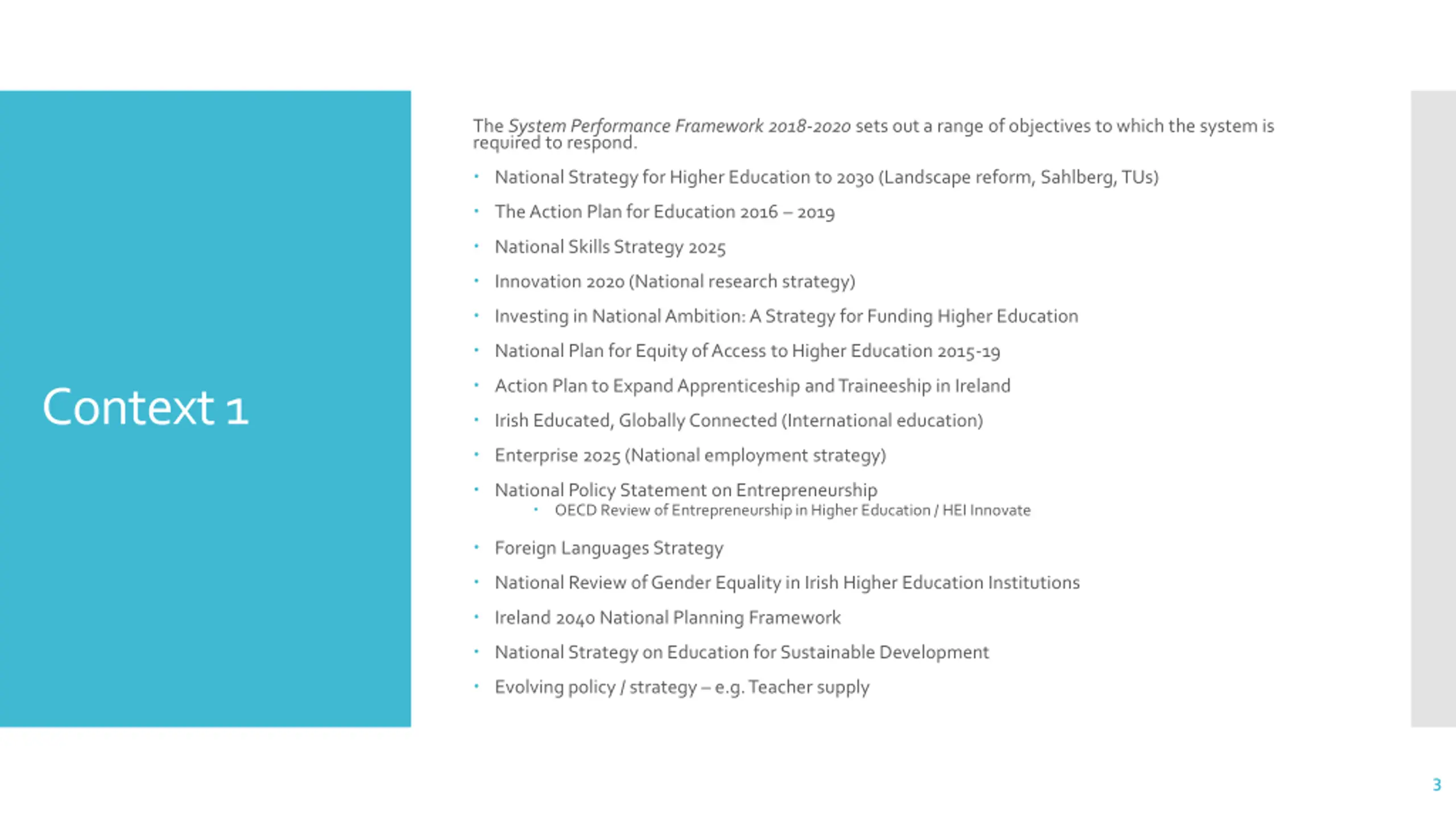 The System Performance Framework 2018-2020 sets out a range of objectives to which the system is required to respond. National Strategy for Higher Education to 2030 (Landscape reform, Sahlberg, TUs) The Action Plan for Education 2016 2019 National Skills Strategy 2025 Innovation 2020 (National research strategy) Investing in National Ambition: A Strategy for Funding Higher Education National Plan for Equity of Access to Higher Education 2015-19 Action Plan to Expand Apprenticeship and Traineeship in Ireland Context 1 Irish Educated, Globally Connected (International education) Enterprise 2025 (National employment strategy) National Policy Statement on Entrepreneurship OECD Review of Entrepreneurship in Higher Education / HEI Innovate Foreign Languages Strategy National Review of Gender Equality in Irish Higher Education Institutions Ireland 2040 National Planning Framework National Strategy on Education for Sustainable Development Evolving policy / strategy e.g. Teacher supply 3
