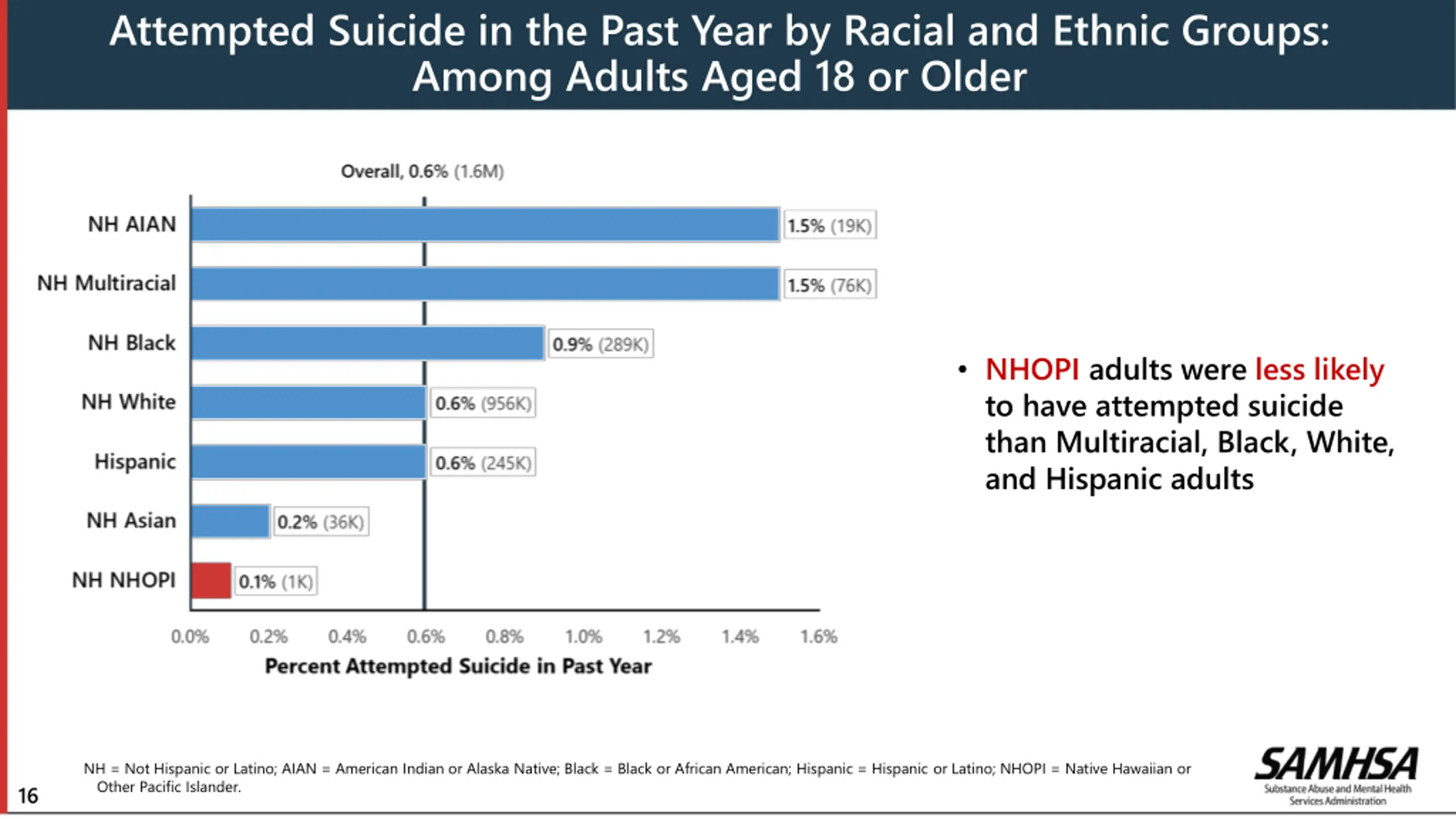 Attempted Suicide in the Past Year by Racial and Ethnic Groups: Among Adults Aged 18 or Older NHOPI adults were less likely to have attempted suicide than Multiracial, Black, White, and Hispanic adults NH = Not Hispanic or Latino; AIAN = American Indian or Alaska Native; Black = Black or African American; Hispanic = Hispanic or Latino; NHOPI = Native Hawaiian or Other Pacific Islander. 16