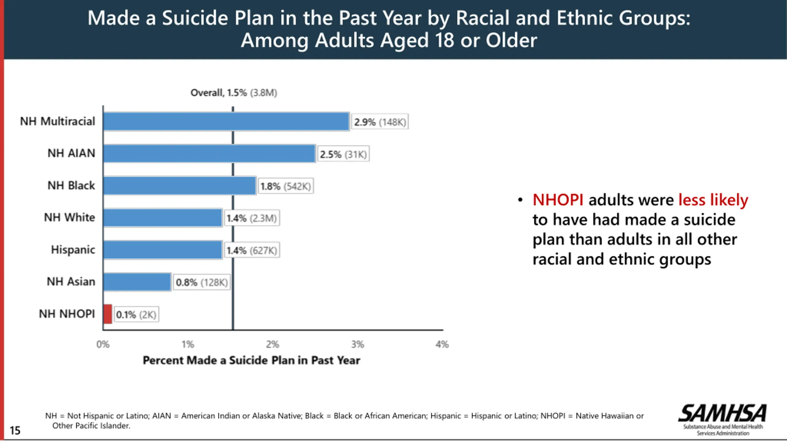 Made a Suicide Plan in the Past Year by Racial and Ethnic Groups: Among Adults Aged 18 or Older NHOPI adults were less likely to have had made a suicide plan than adults in all other racial and ethnic groups NH = Not Hispanic or Latino; AIAN = American Indian or Alaska Native; Black = Black or African American; Hispanic = Hispanic or Latino; NHOPI = Native Hawaiian or Other Pacific Islander. 15