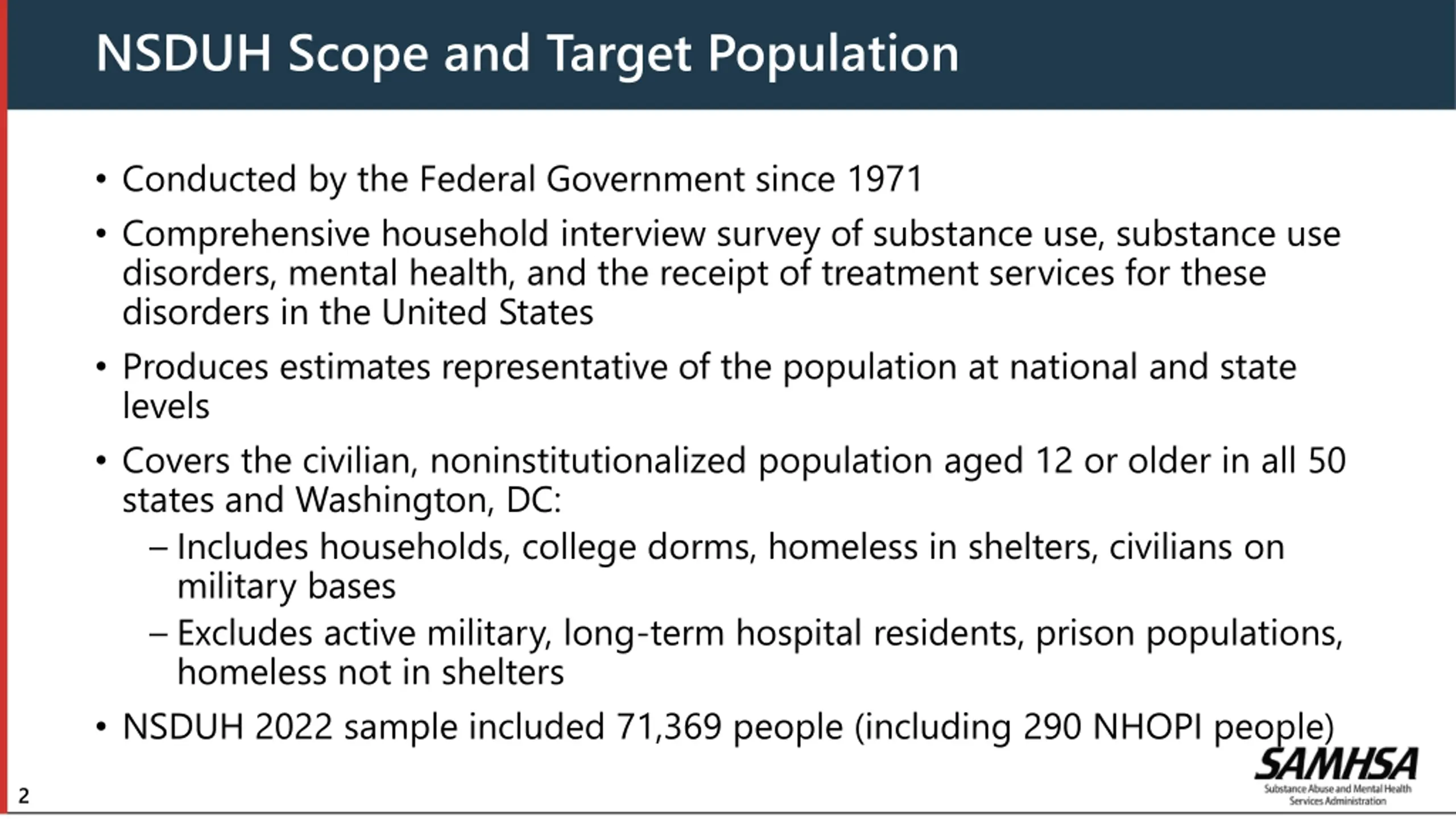 NSDUH Scope and Target Population Conducted by the Federal Government since 1971 Comprehensive household interview survey of substance use, substance use disorders, mental health, and the receipt of treatment services for these disorders in the United States Produces estimates representative of the population at national and state levels Covers the civilian, noninstitutionalized population aged 12 or older in all 50 states and Washington, DC: Includes households, college dorms, homeless in shelters, civilians on military bases Excludes active military, long-term hospital residents, prison populations, homeless not in shelters NSDUH 2022 sample included 71,369 people (including 290 NHOPI people) 2