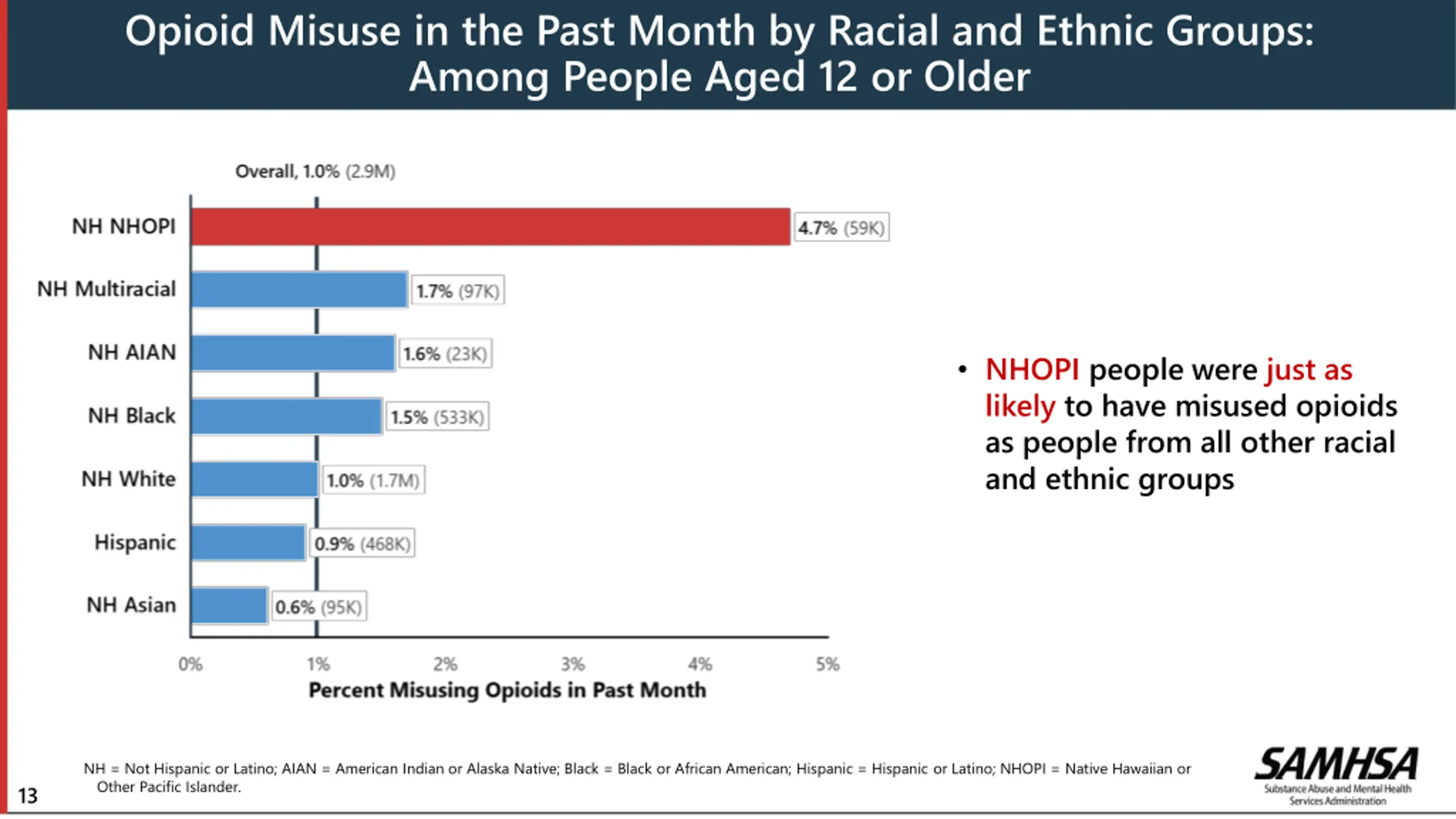 Opioid Misuse in the Past Month by Racial and Ethnic Groups: Among People Aged 12 or Older NHOPI people were just as likely to have misused opioids as people from all other racial and ethnic groups NH = Not Hispanic or Latino; AIAN = American Indian or Alaska Native; Black = Black or African American; Hispanic = Hispanic or Latino; NHOPI = Native Hawaiian or Other Pacific Islander. 13