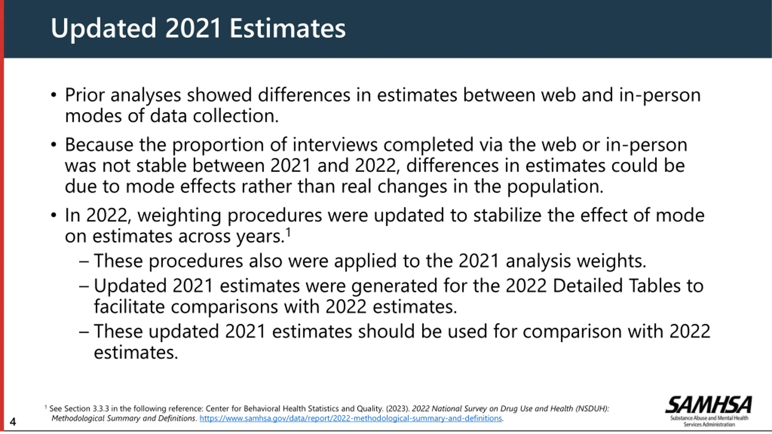 Updated 2021 Estimates Prior analyses showed differences in estimates between web and in-person modes of data collection. Because the proportion of interviews completed via the web or in-person was not stable between 2021 and 2022, differences in estimates could be due to mode effects rather than real changes in the population. In 2022, weighting procedures were updated to stabilize the effect of mode on estimates across years.1 These procedures also were applied to the 2021 analysis weights. Updated 2021 estimates were generated for the 2022 Detailed Tables to facilitate comparisons with 2022 estimates. These updated 2021 estimates should be used for comparison with 2022 estimates. 1 See Section 3.3.3 in the following reference: Center for Behavioral Health Statistics and Quality. (2023). 2022 National Survey on Drug Use and Health (NSDUH): Methodological Summary and Definitions. https://www.samhsa.gov/data/report/2022-methodological-summary-and-definitions. 4