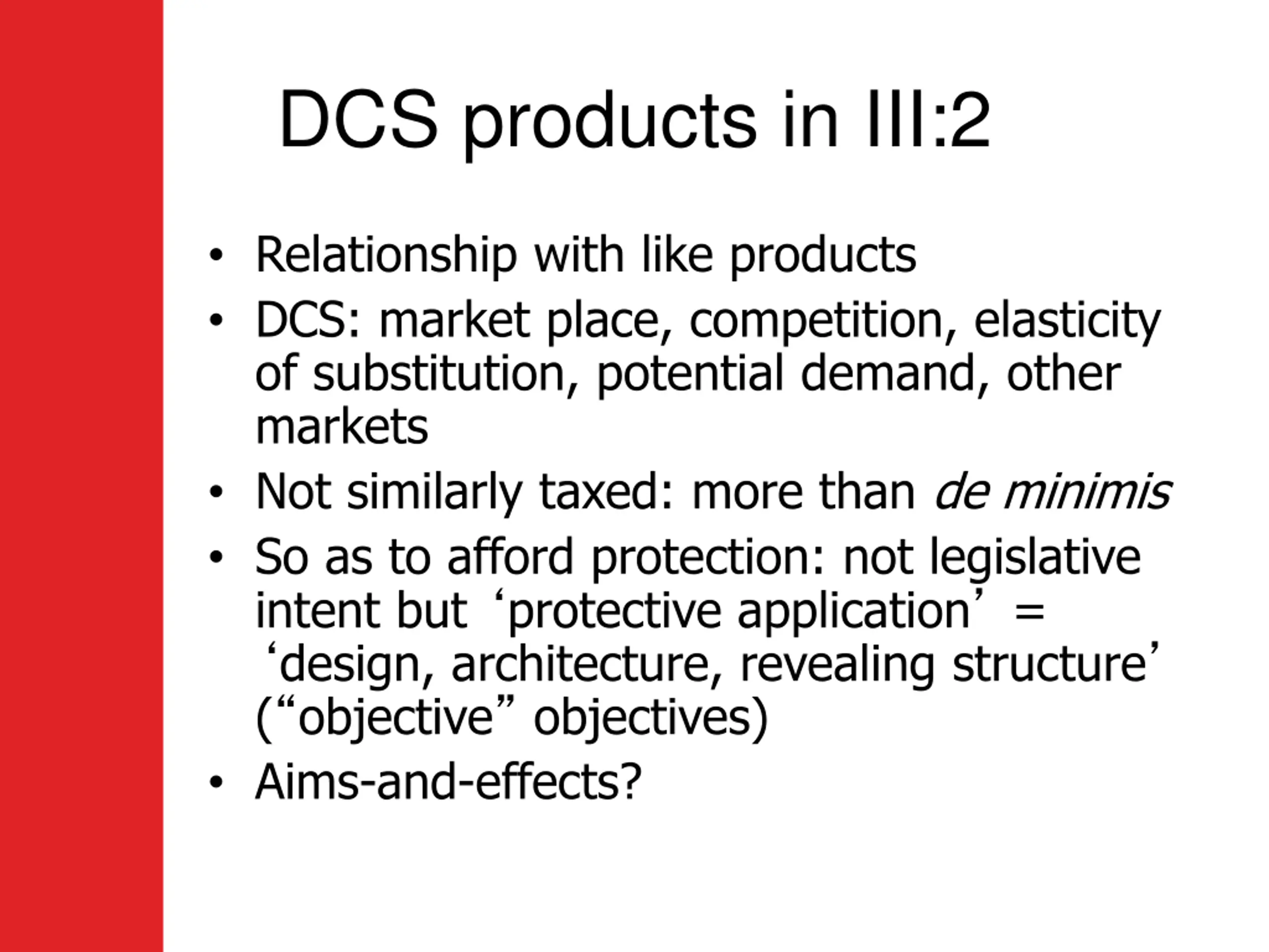 DCS products in III:2 Relationship with like products DCS: market place, competition, elasticity of substitution, potential demand, other markets Not similarly taxed: more than de minimis So as to afford protection: not legislative intent but protective application = design, architecture, revealing structure ( objective objectives) Aims-and-effects?