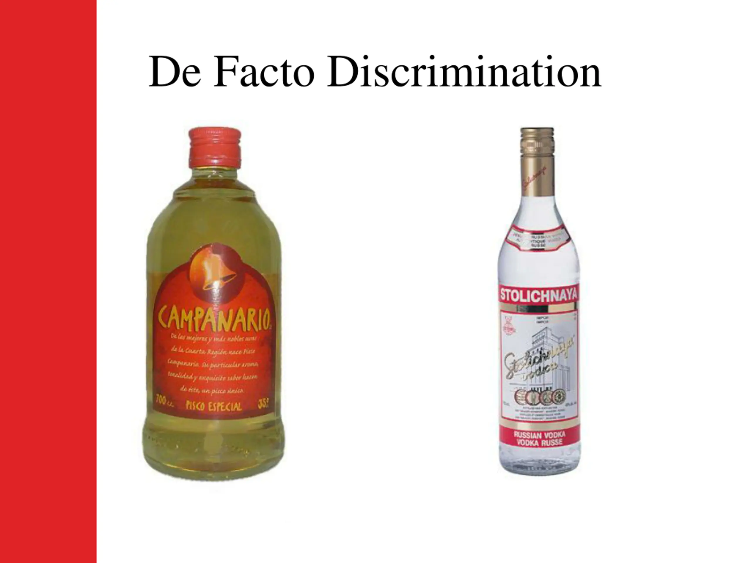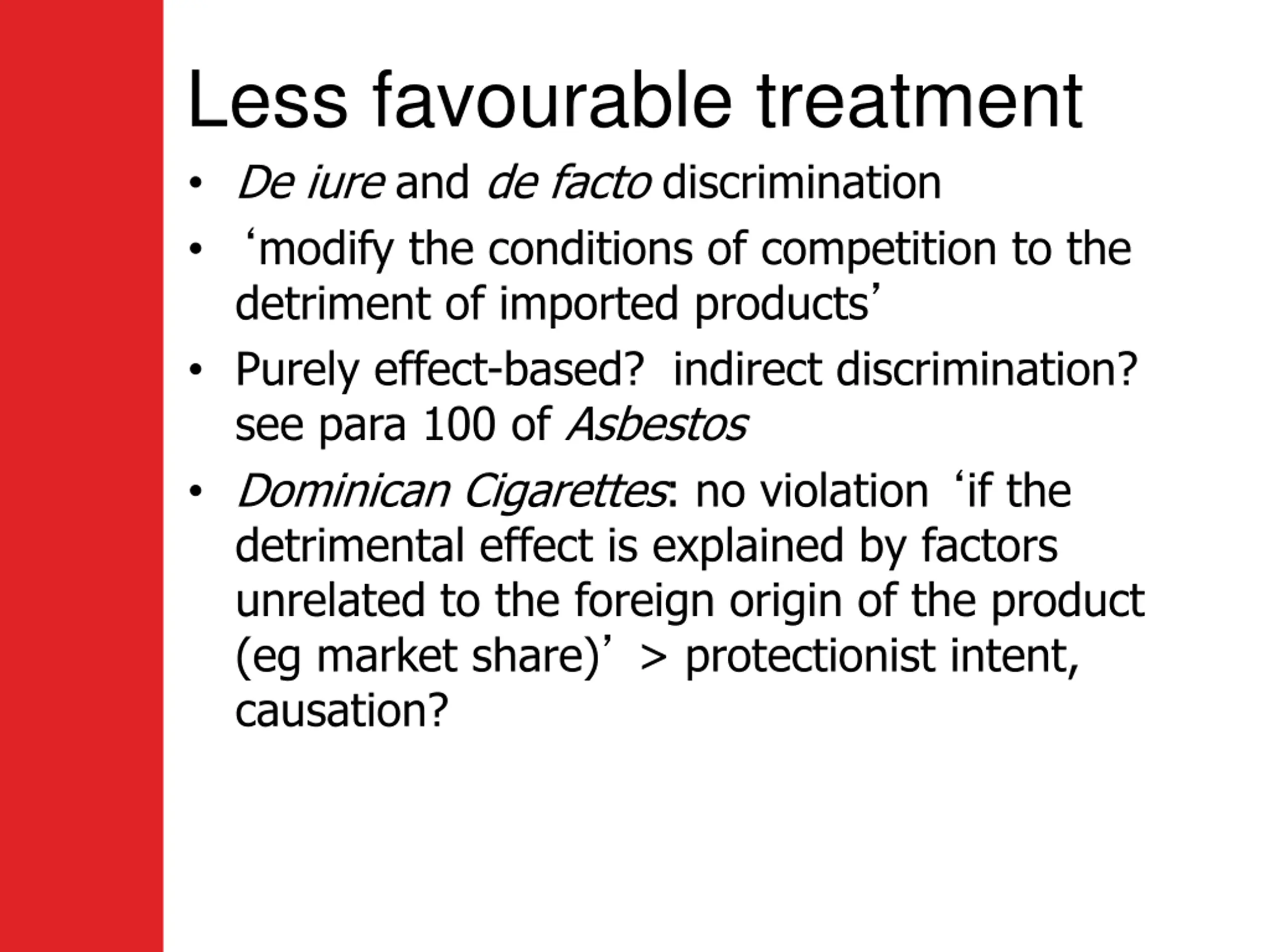 Less favourable treatment De iure and de facto discrimination modify the conditions of competition to the detriment of imported products Purely effect-based? indirect discrimination? see para 100 of Asbestos Dominican Cigarettes: no violation if the detrimental effect is explained by factors unrelated to the foreign origin of the product (eg market share) > protectionist intent, causation?