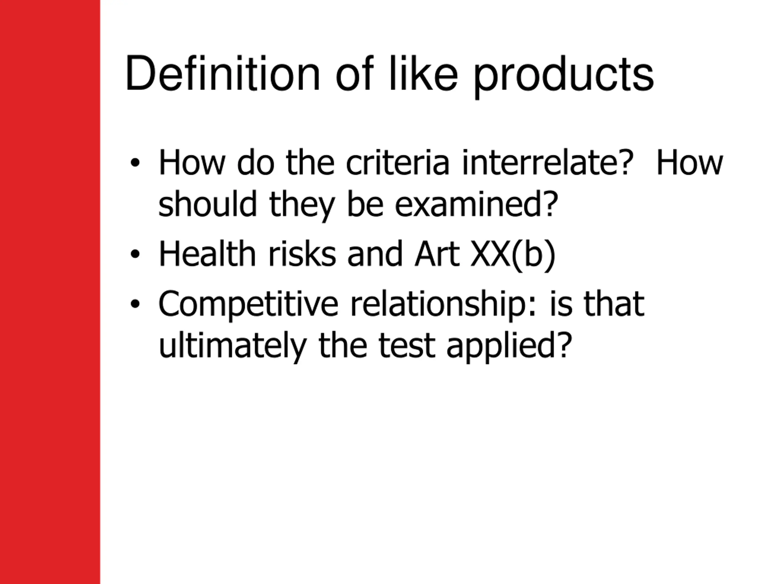 Definition of like products How do the criteria interrelate? How should they be examined? Health risks and Art XX(b) Competitive relationship: is that ultimately the test applied?