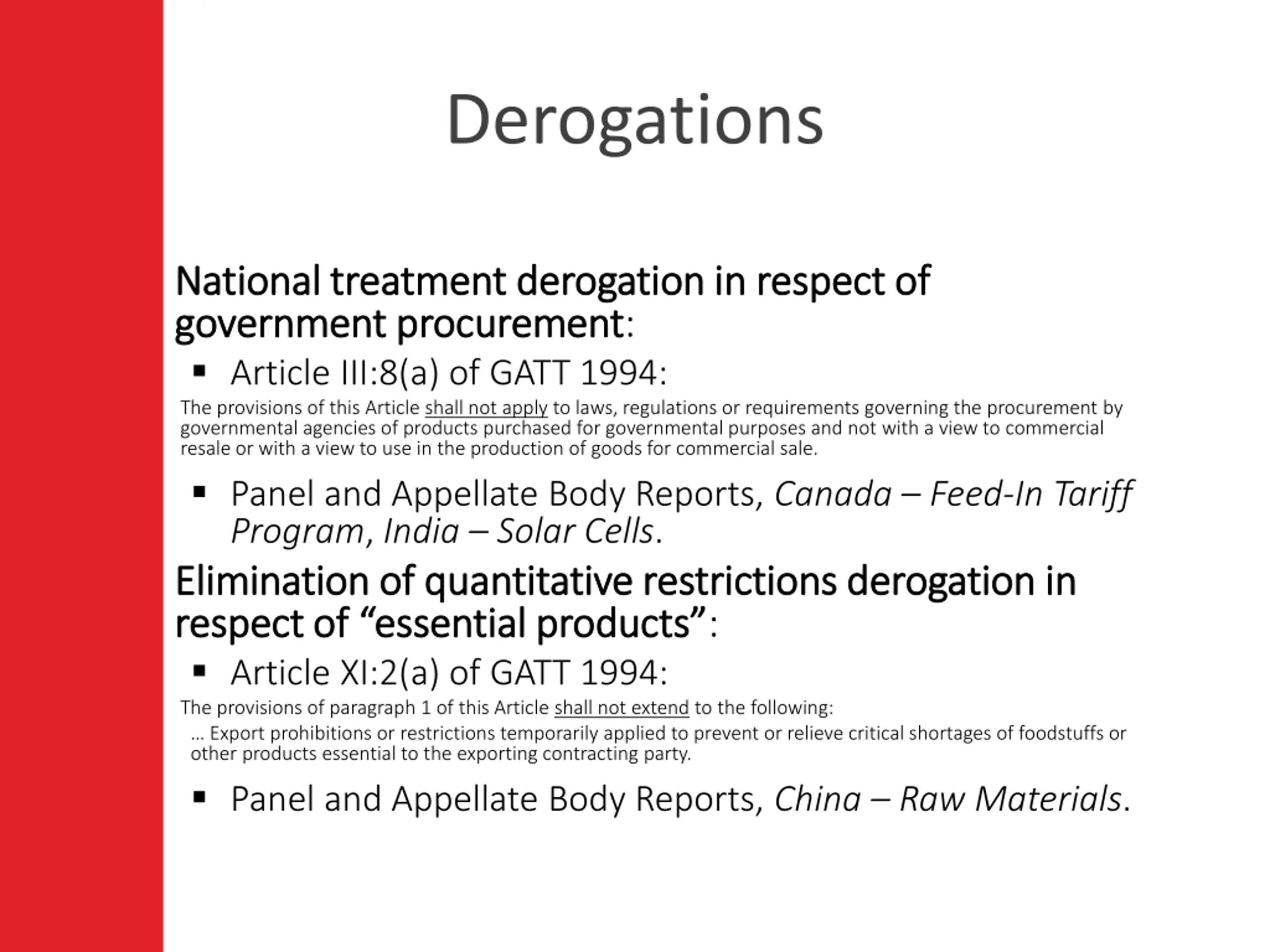 Derogations National treatment derogation in respect of National treatment derogation in respect of government procurement government procurement: Article III:8(a) of GATT 1994: The provisions of this Article shall not apply to laws, regulations or requirements governing the procurement by governmental agencies of products purchased for governmental purposes and not with a view to commercial resale or with a view to use in the production of goods for commercial sale. Panel and Appellate Body Reports, Canada Feed-In Tariff Program, India Solar Cells. Elimination of quantitative restrictions derogation in Elimination of quantitative restrictions derogation in respect of essential products respect of essential products : Article XI:2(a) of GATT 1994: The provisions of paragraph 1 of this Article shall not extend to the following: Export prohibitions or restrictions temporarily applied to prevent or relieve critical shortages of foodstuffs or other products essential to the exporting contracting party. Panel and Appellate Body Reports, China Raw Materials.