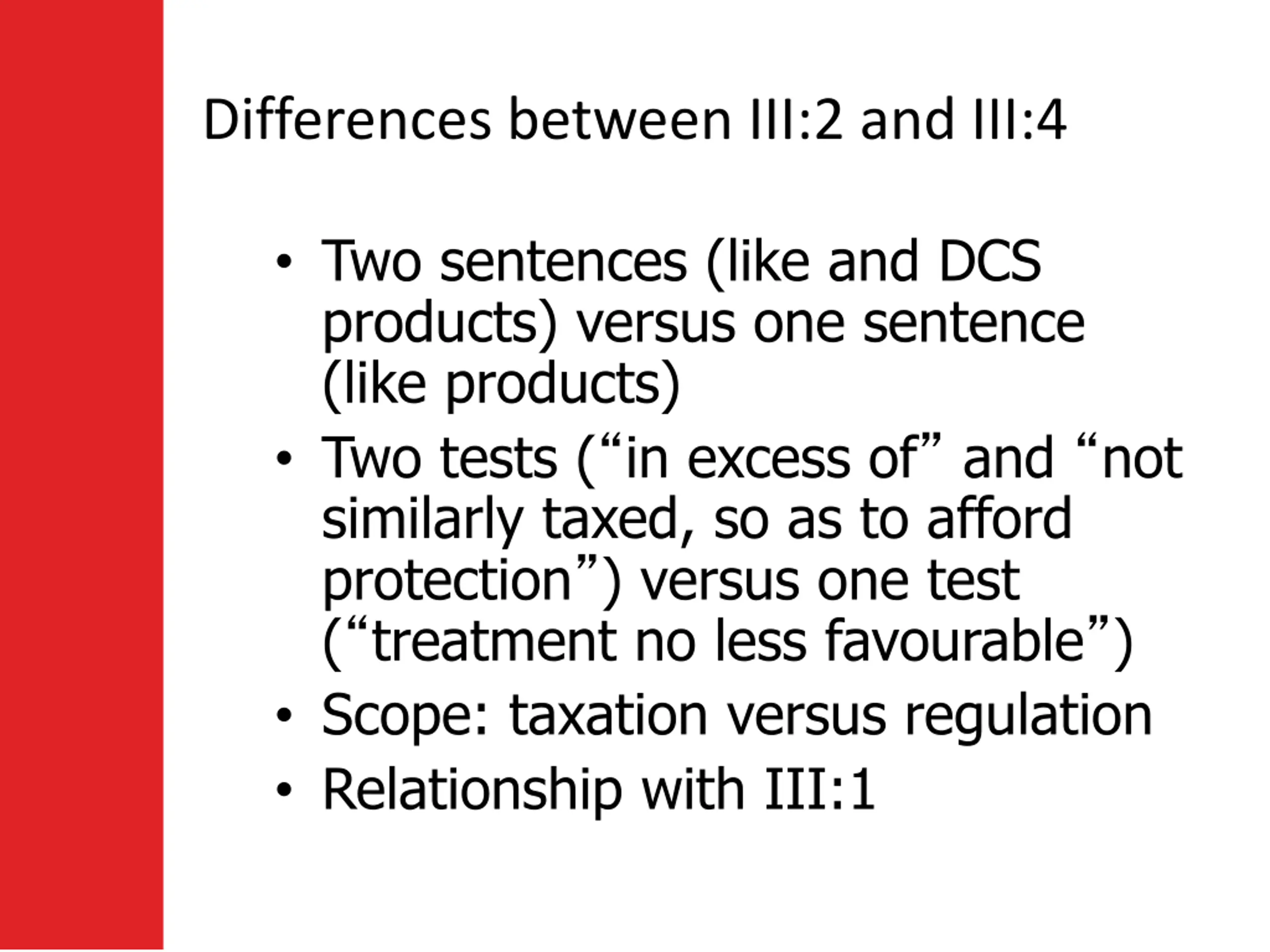 Differences between III:2 and III:4 Two sentences (like and DCS products) versus one sentence (like products) Two tests ( in excess of and not similarly taxed, so as to afford protection ) versus one test ( treatment no less favourable ) Scope: taxation versus regulation Relationship with III:1