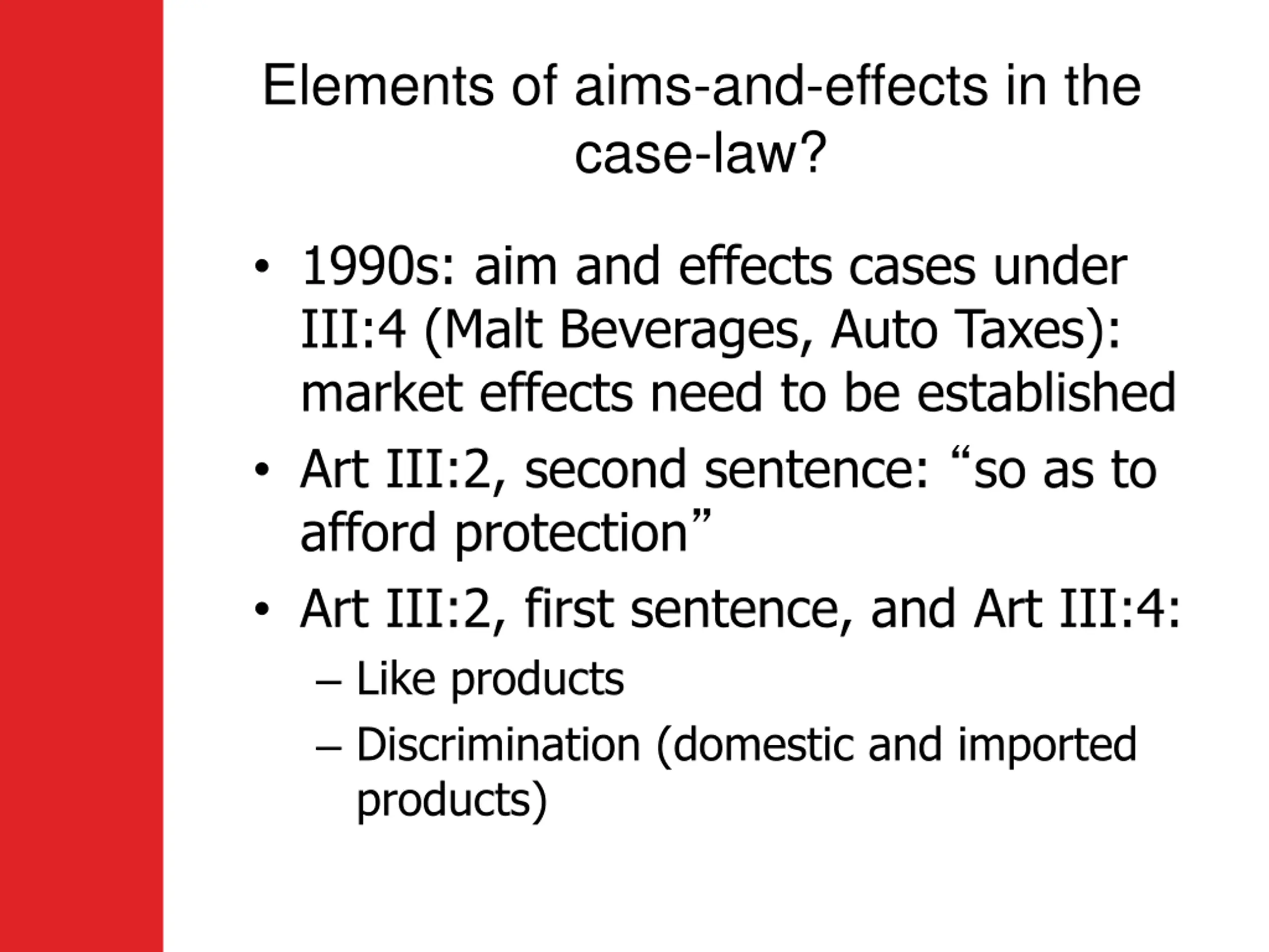 Elements of aims-and-effects in the case-law? 1990s: aim and effects cases under III:4 (Malt Beverages, Auto Taxes): market effects need to be established Art III:2, second sentence: so as to afford protection Art III:2, first sentence, and Art III:4: Like products Discrimination (domestic and imported products)