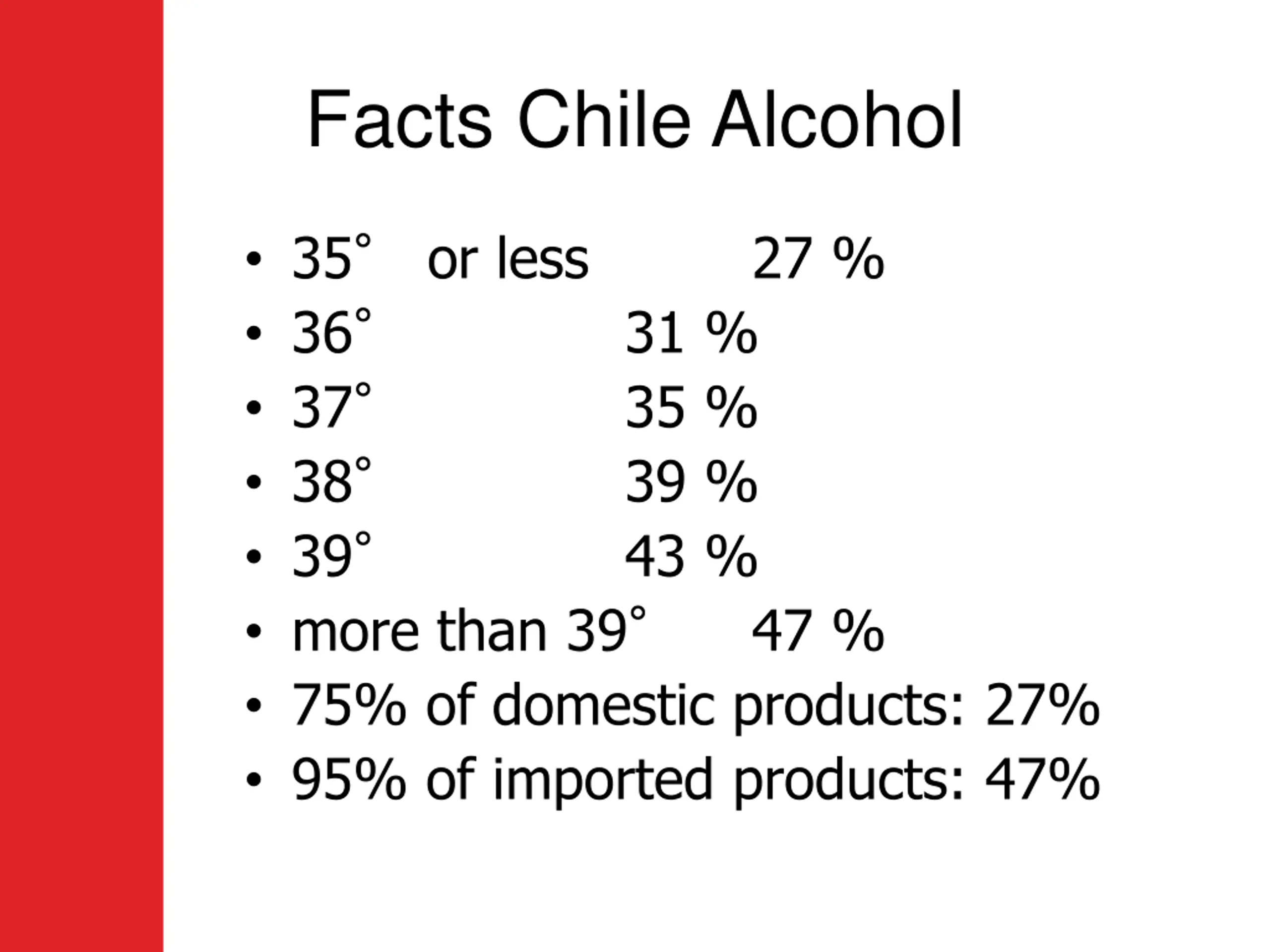 Facts Chile Alcohol 35 or less 36 37 38 39 more than 39 75% of domestic products: 27% 95% of imported products: 47% 27 % 31 % 35 % 39 % 43 % 47 %